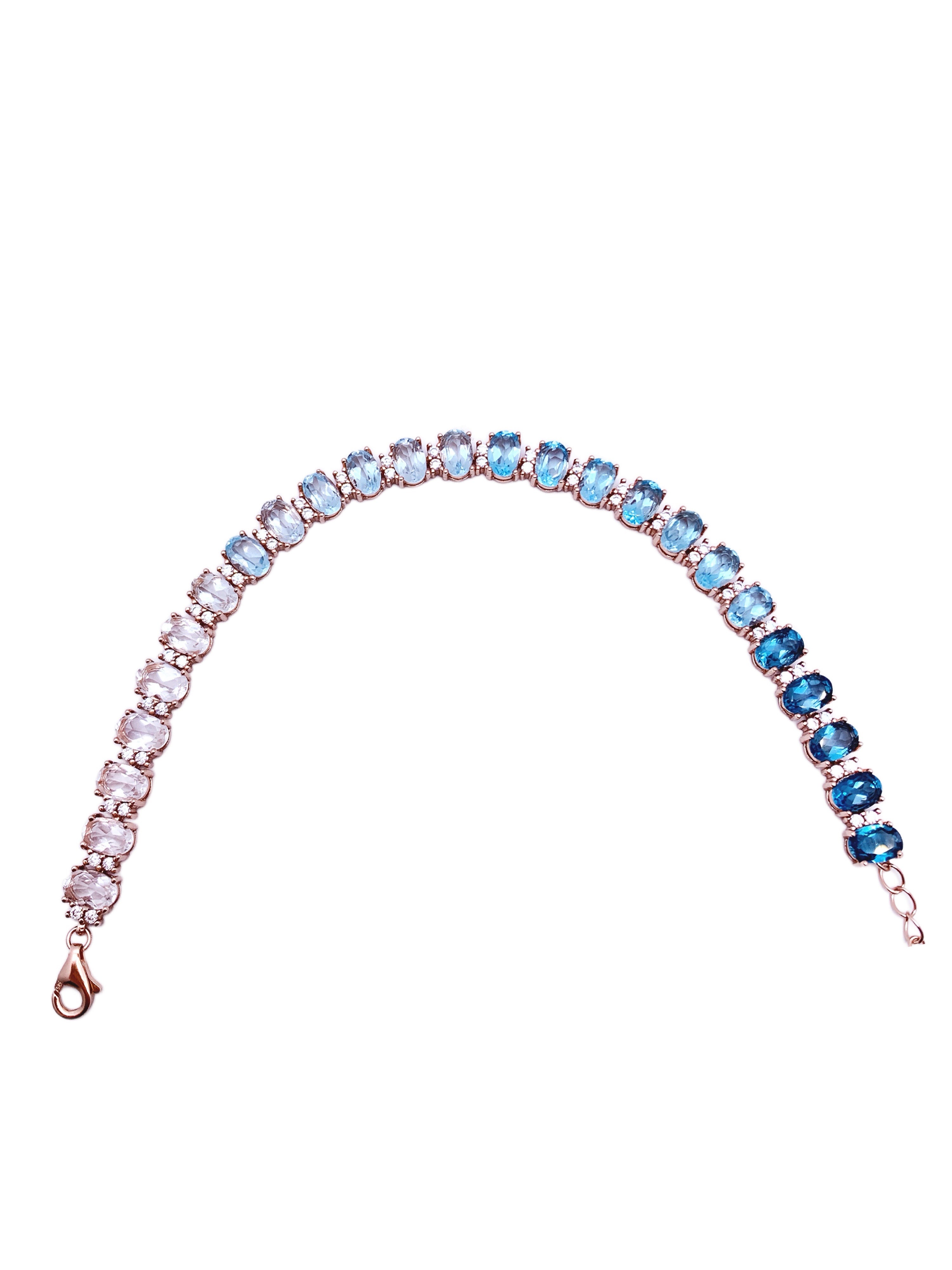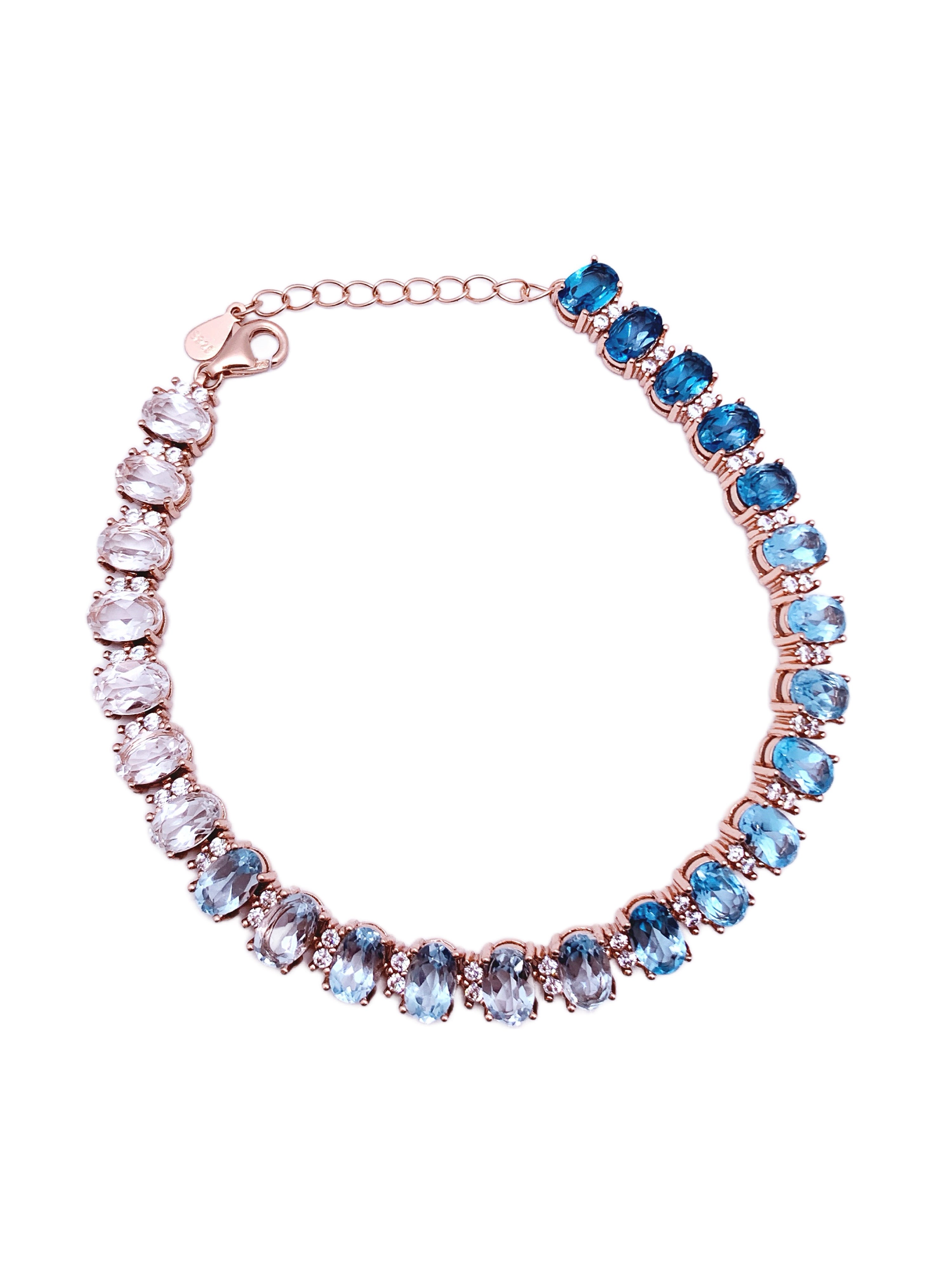 This stunning tennis bracelet captures the serene beauty of the ocean with a gradient of blue topaz gemstones, elegantly transitioning from light to deep blue hues. Each oval-cut topaz is meticulously set in rose gold, interspersed with sparkling diamond accents that add a touch of glamour and sophistication. The graceful color progression creates a captivating effect, making this bracelet perfect for those who appreciate elegance and artistry. Finished with an adjustable clasp, this piece ensures a comfortable and secure fit, adding a luxurious sparkle to any occasion.