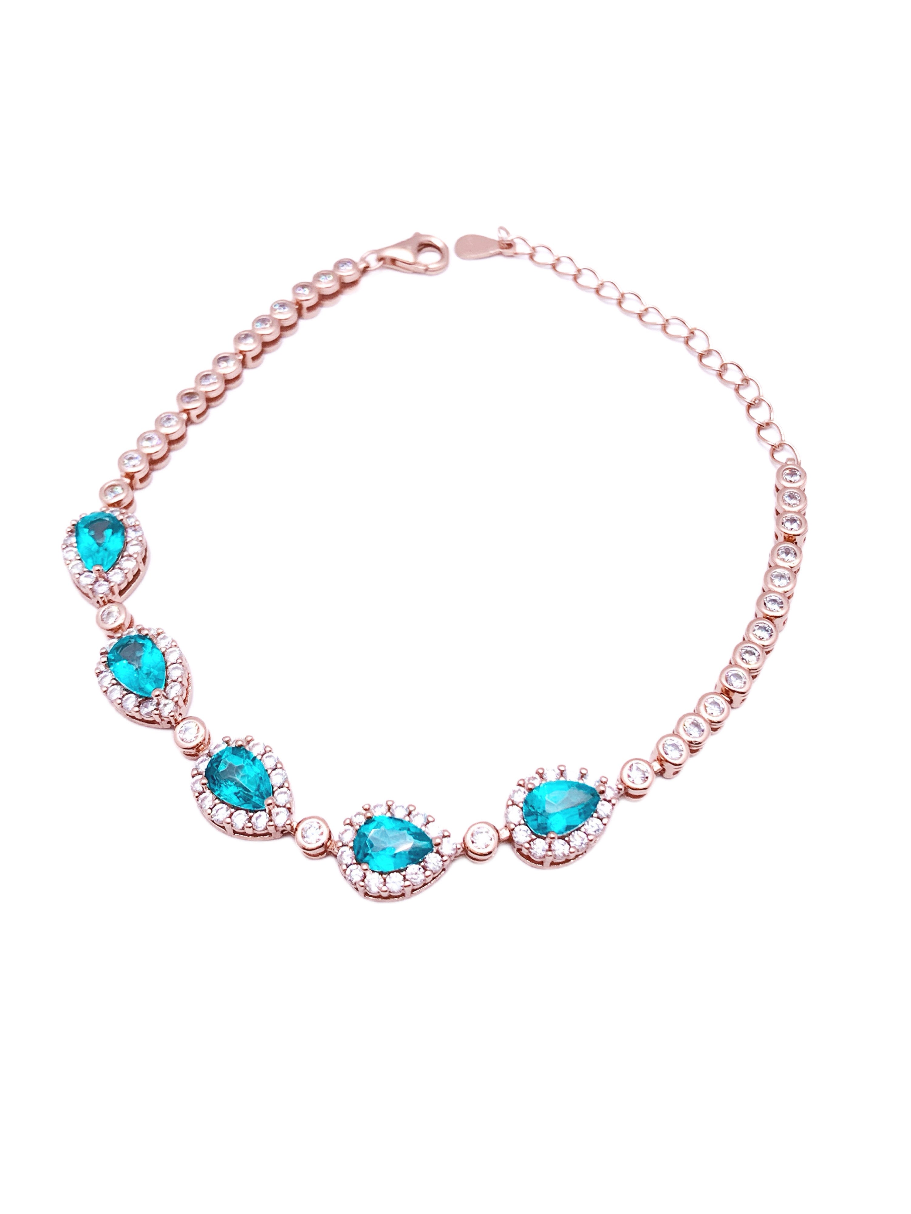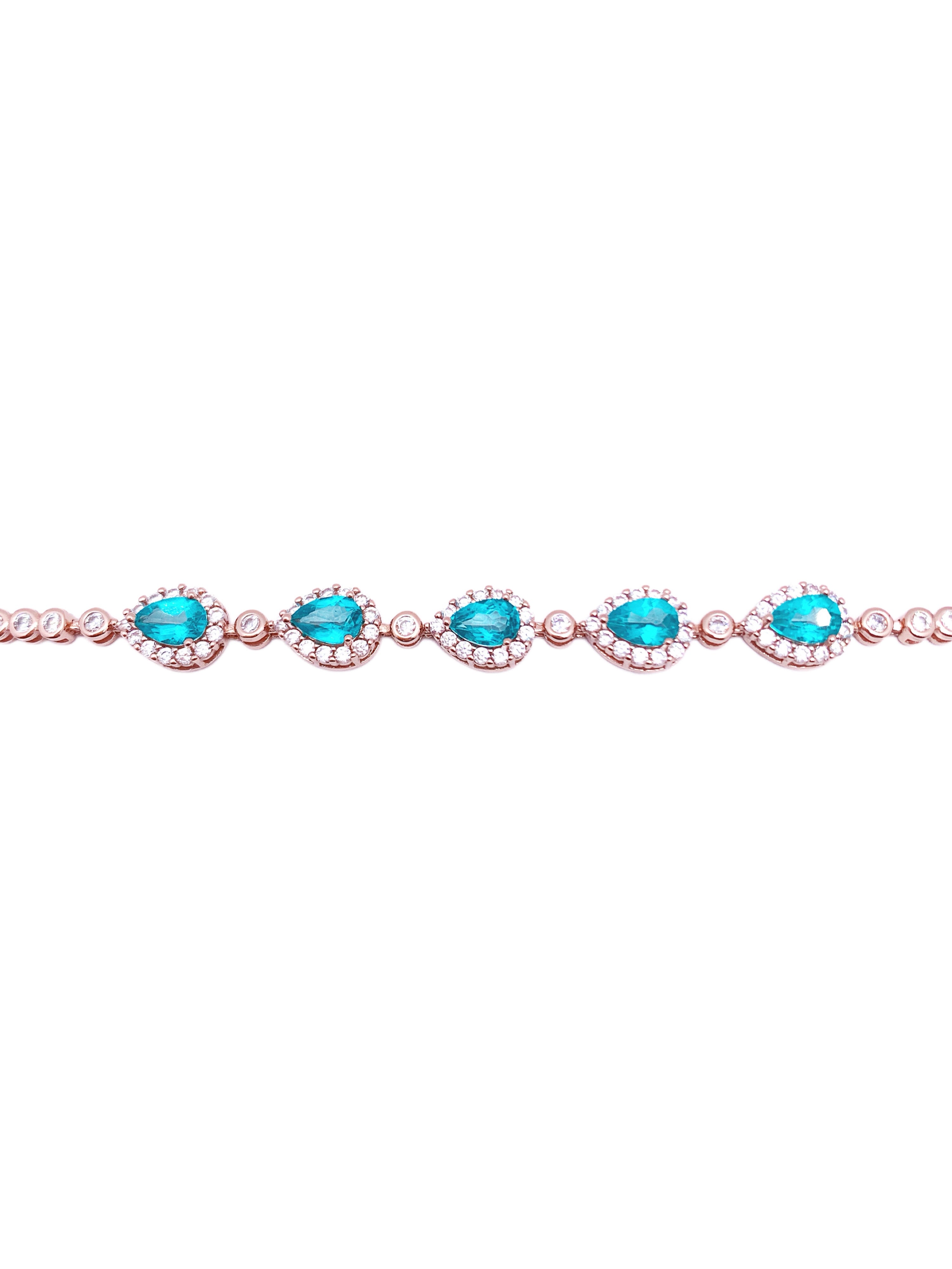 This stunning bracelet features a series of teardrop-shaped aquamarine stones, each surrounded by a halo of sparkling diamonds, creating a luxurious and radiant effect. The aquamarine stones exude a refreshing blue hue, symbolizing serenity and elegance. Set in polished rose gold (plated), the bracelet is further adorned with bezel-set diamonds along the band, adding an extra touch of glamour. With an adjustable chain for a comfortable fit, this bracelet is perfect for special occasions or as a standout piece to elevate everyday wear.