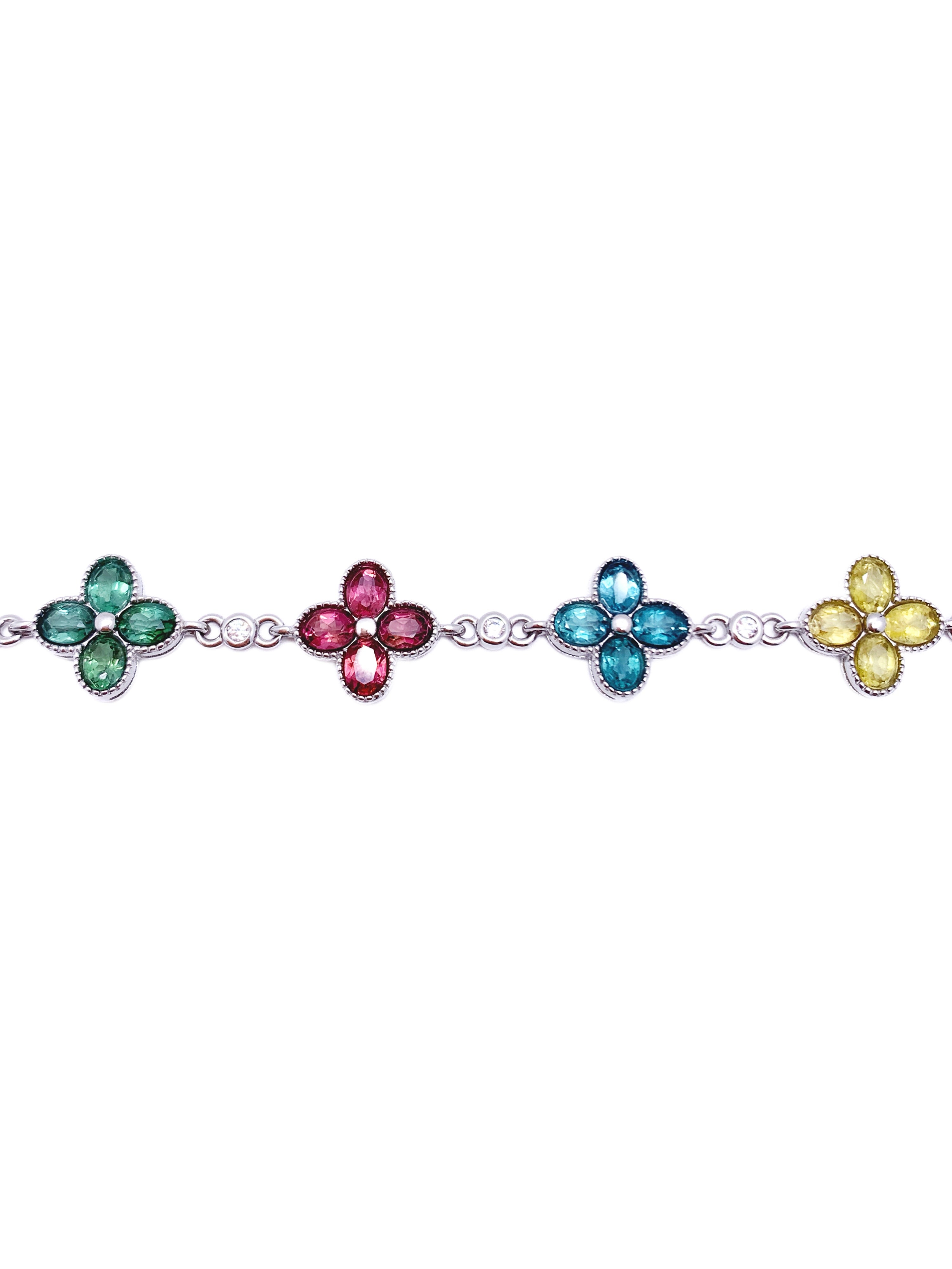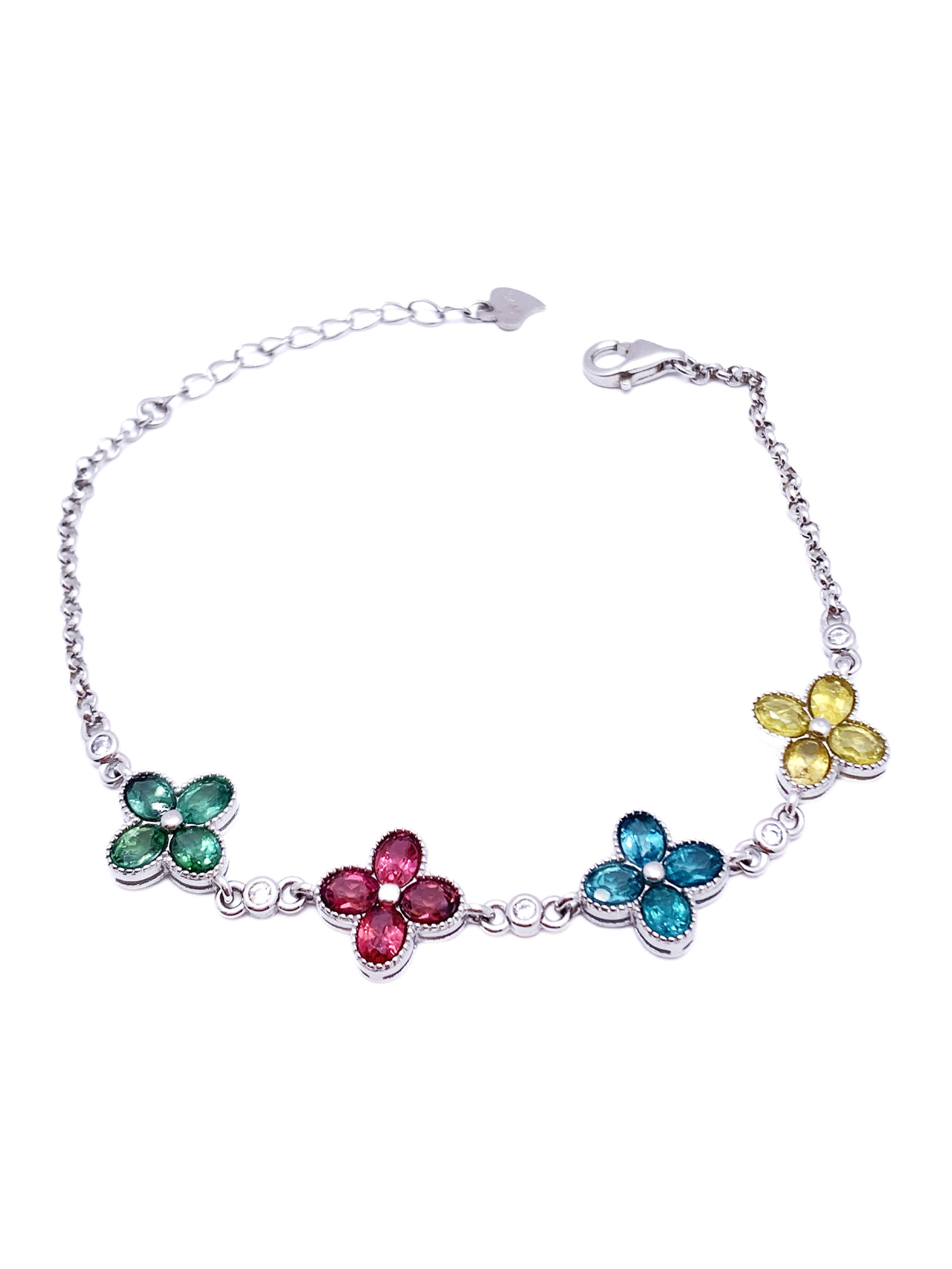 This vibrant and playful bracelet features a series of charming floral motifs, each adorned with petals of different colored gemstones—green, pink, blue, and yellow. Set in sterling silver, the colorful gemstones create a joyful design that symbolizes growth, love, serenity, and happiness. With an adjustable chain for a comfortable fit, this bracelet is perfect for adding a pop of color to any outfit. Ideal for those who love fun and unique jewelry, this piece is a celebration of nature and color.