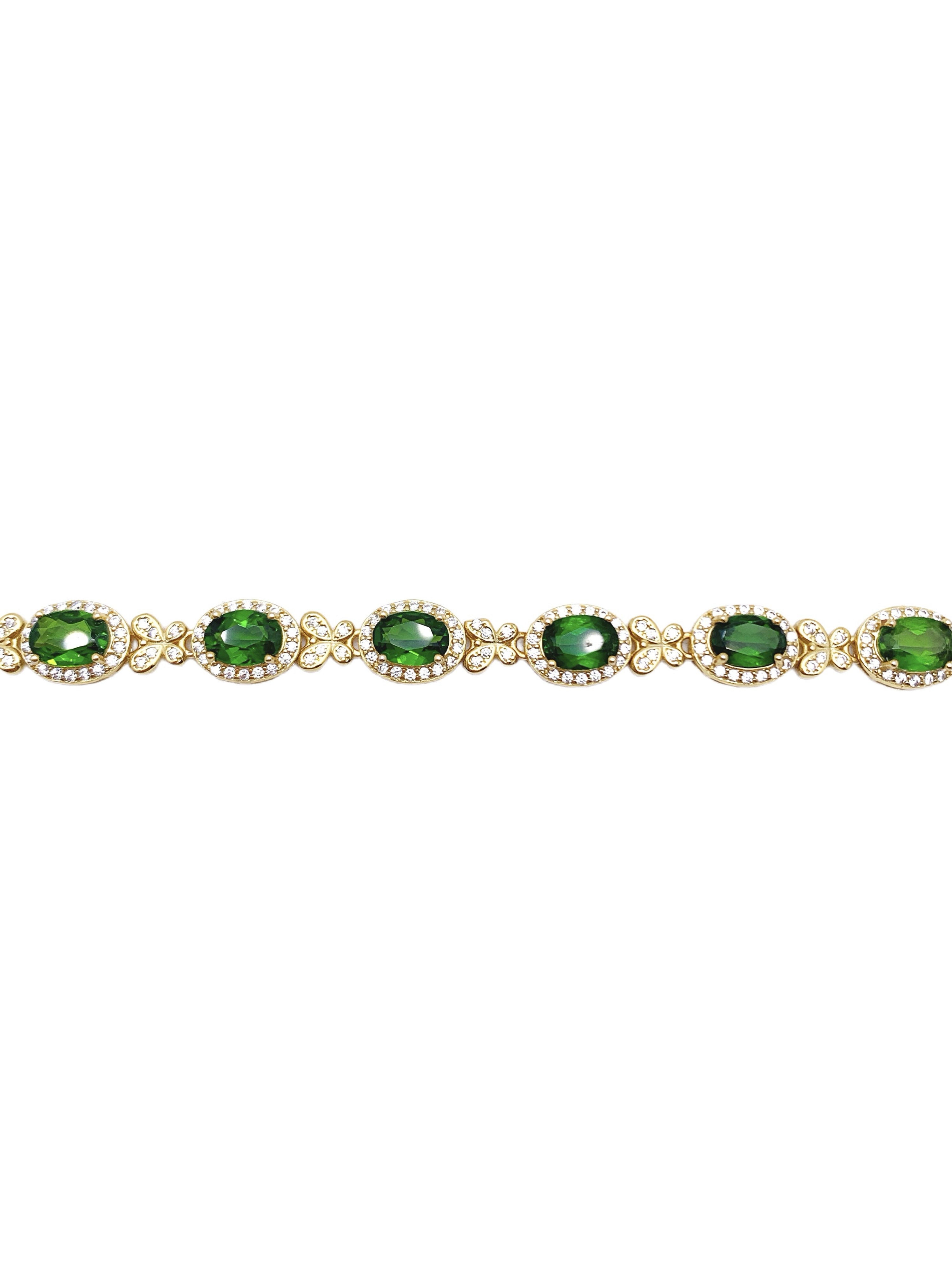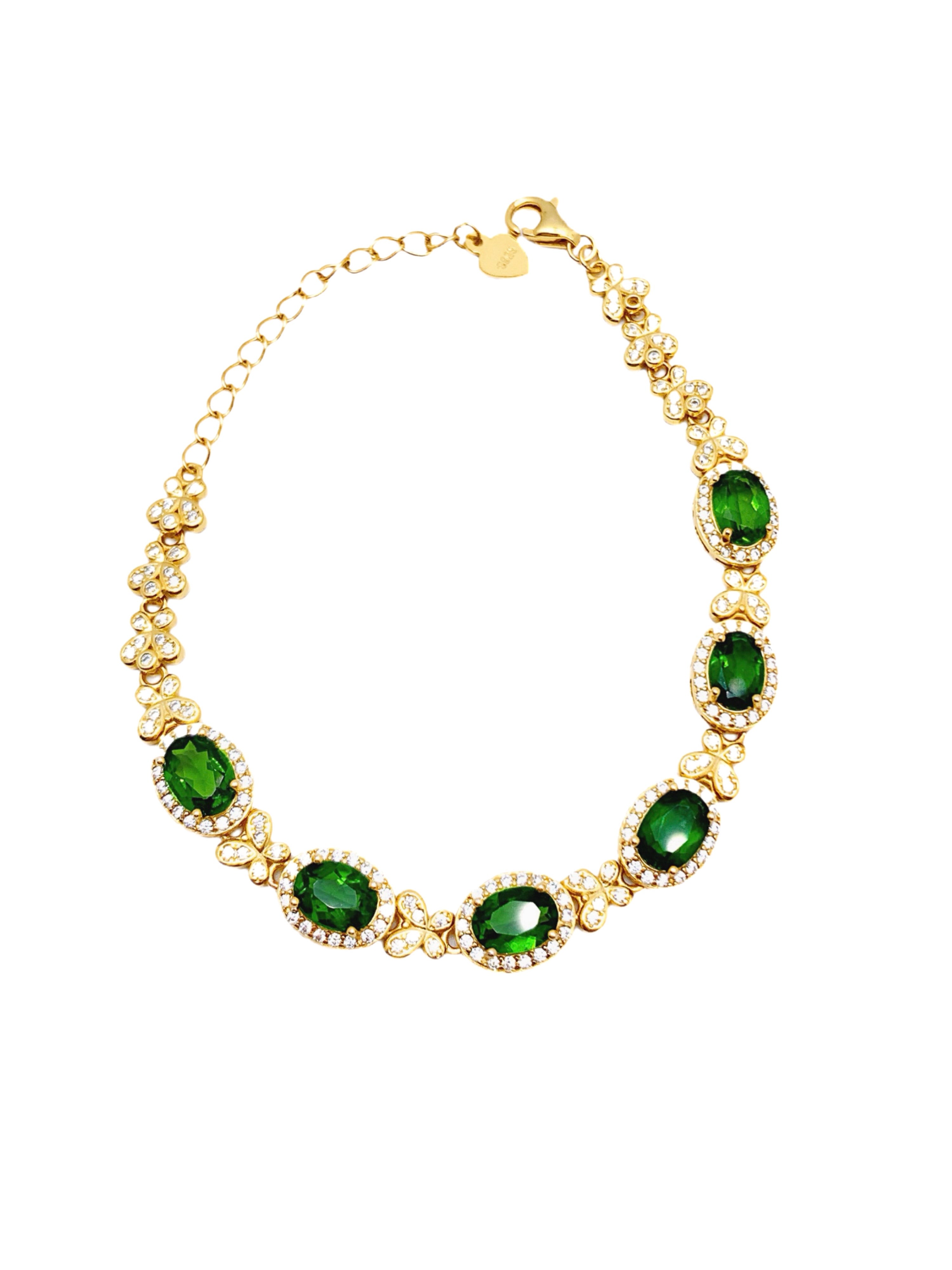 This exquisite bracelet features a series of rich green oval gemstones, each set within a sparkling halo of clear gemstones that accentuate their vibrant color. Connecting each oval stone is a delicate floral motif adorned with smaller, brilliant crystals, creating a graceful and elegant flow throughout the piece. The bracelet is crafted in a luxurious gold finish, adding warmth and sophistication. An adjustable clasp allows for a comfortable and customized fit.