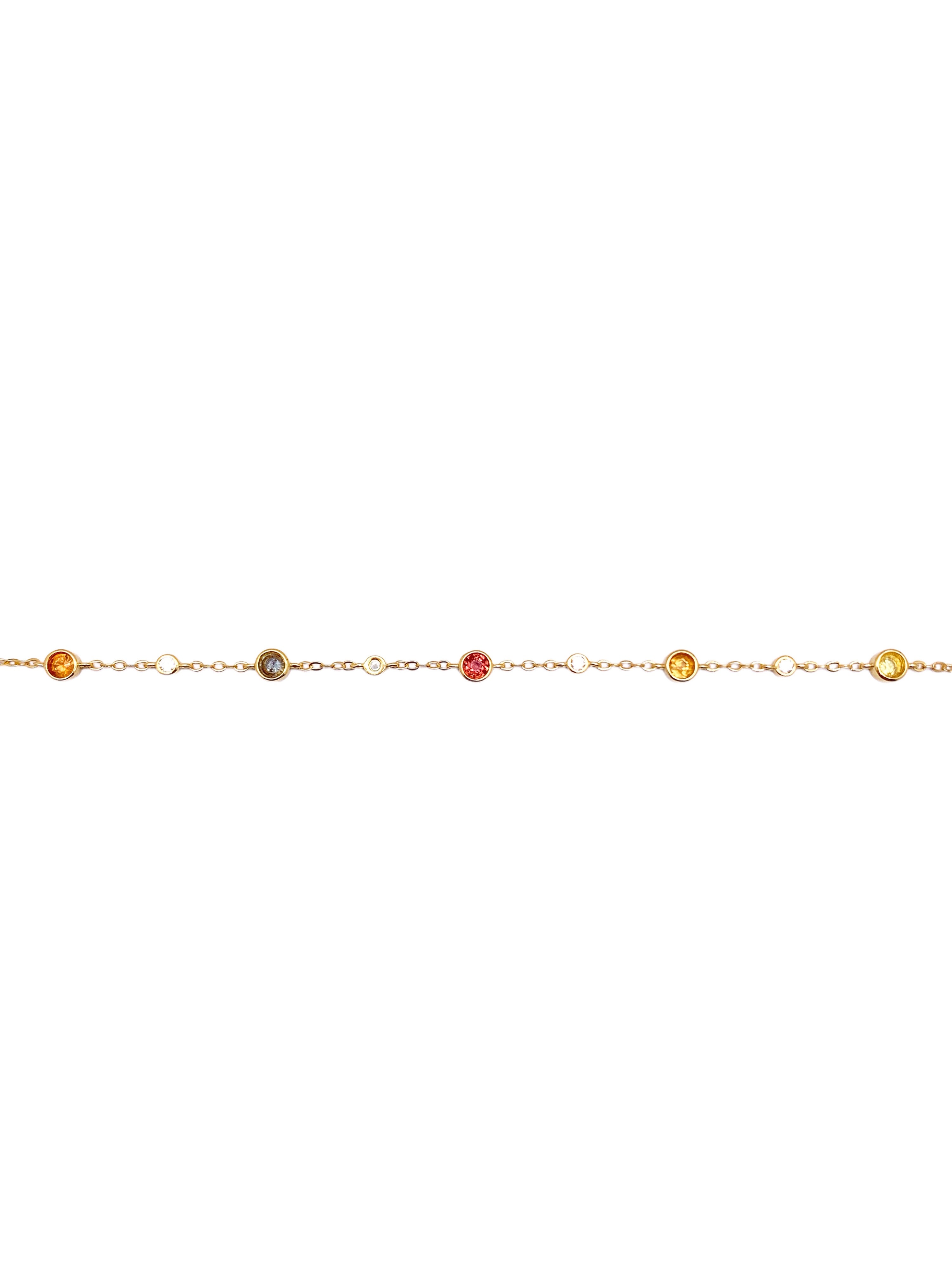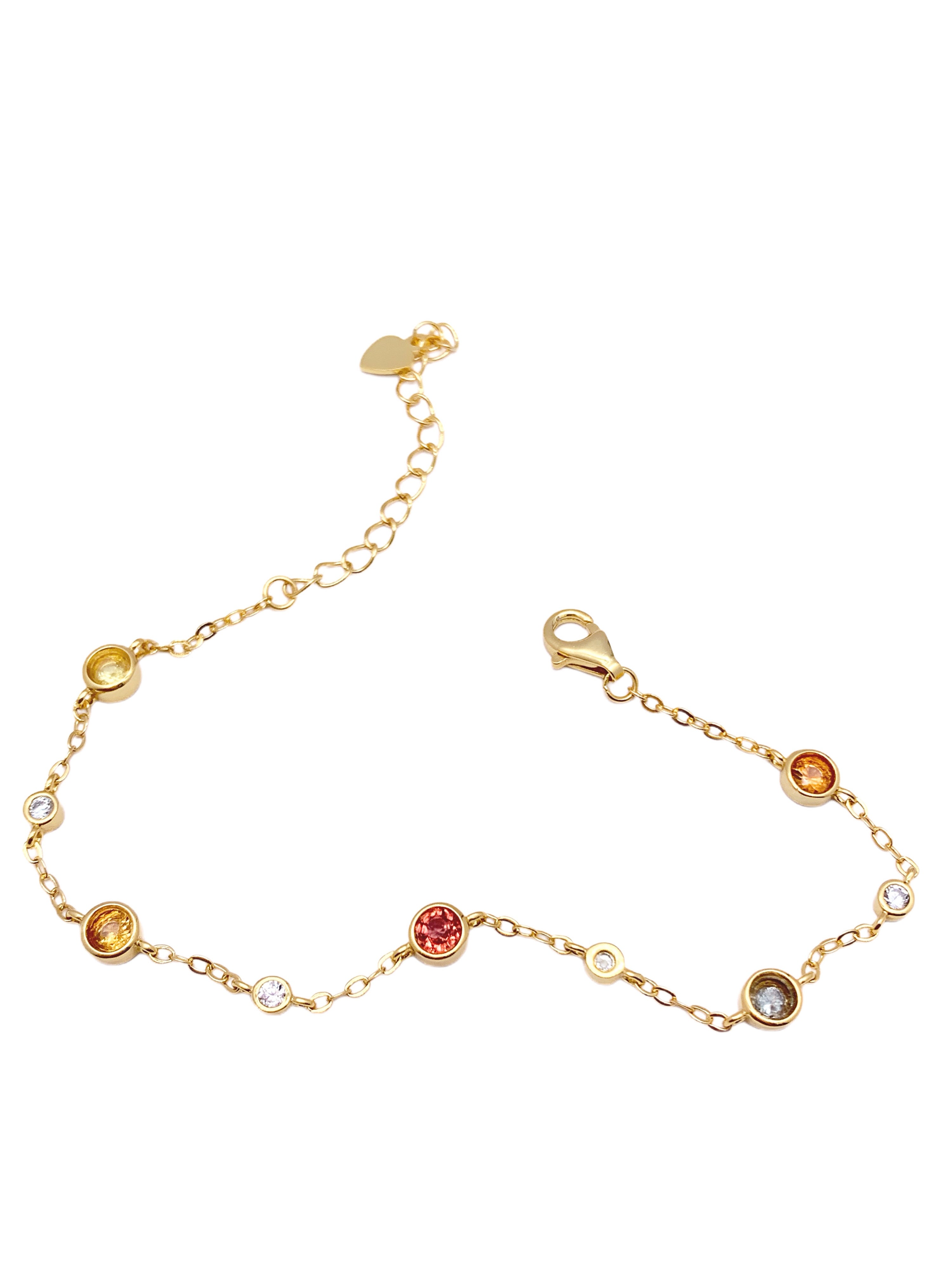 This elegant gold bracelet features a dainty chain adorned with bezel-set gemstones in an array of captivating colors, creating a playful yet sophisticated look. Each gemstone is encased in a round gold plated bezel setting, adding a touch of modern simplicity to the design. The bracelet is completed with a secure lobster clasp and an adjustable chain with a tiny heart charm at the end, adding a sweet finishing touch.