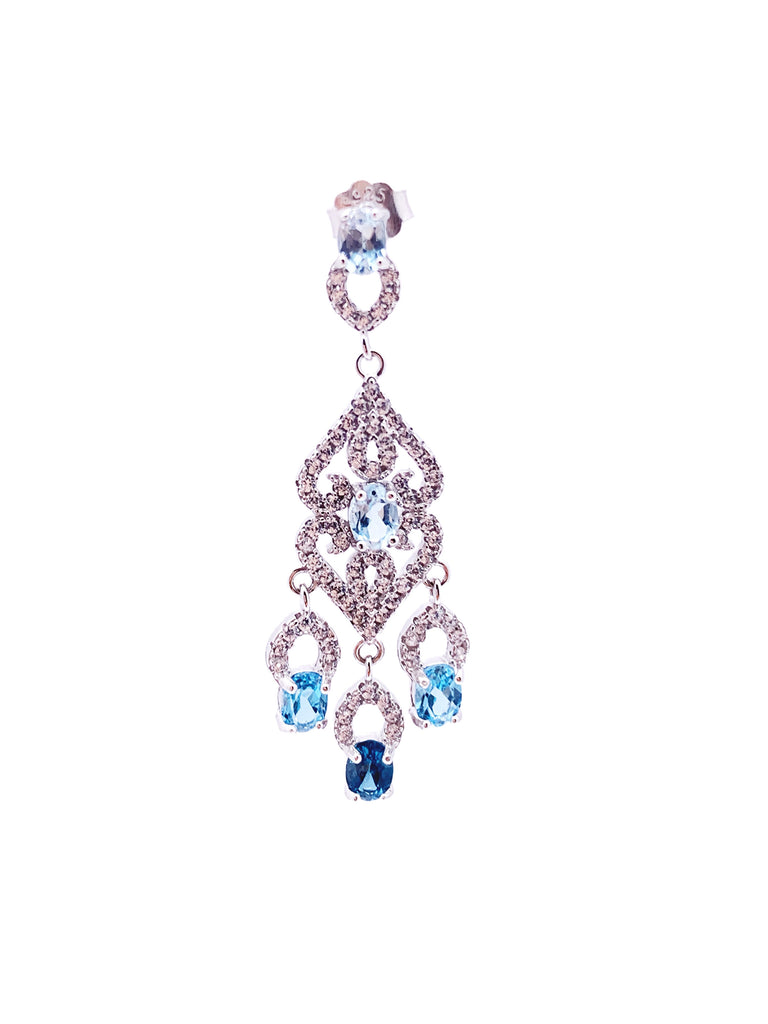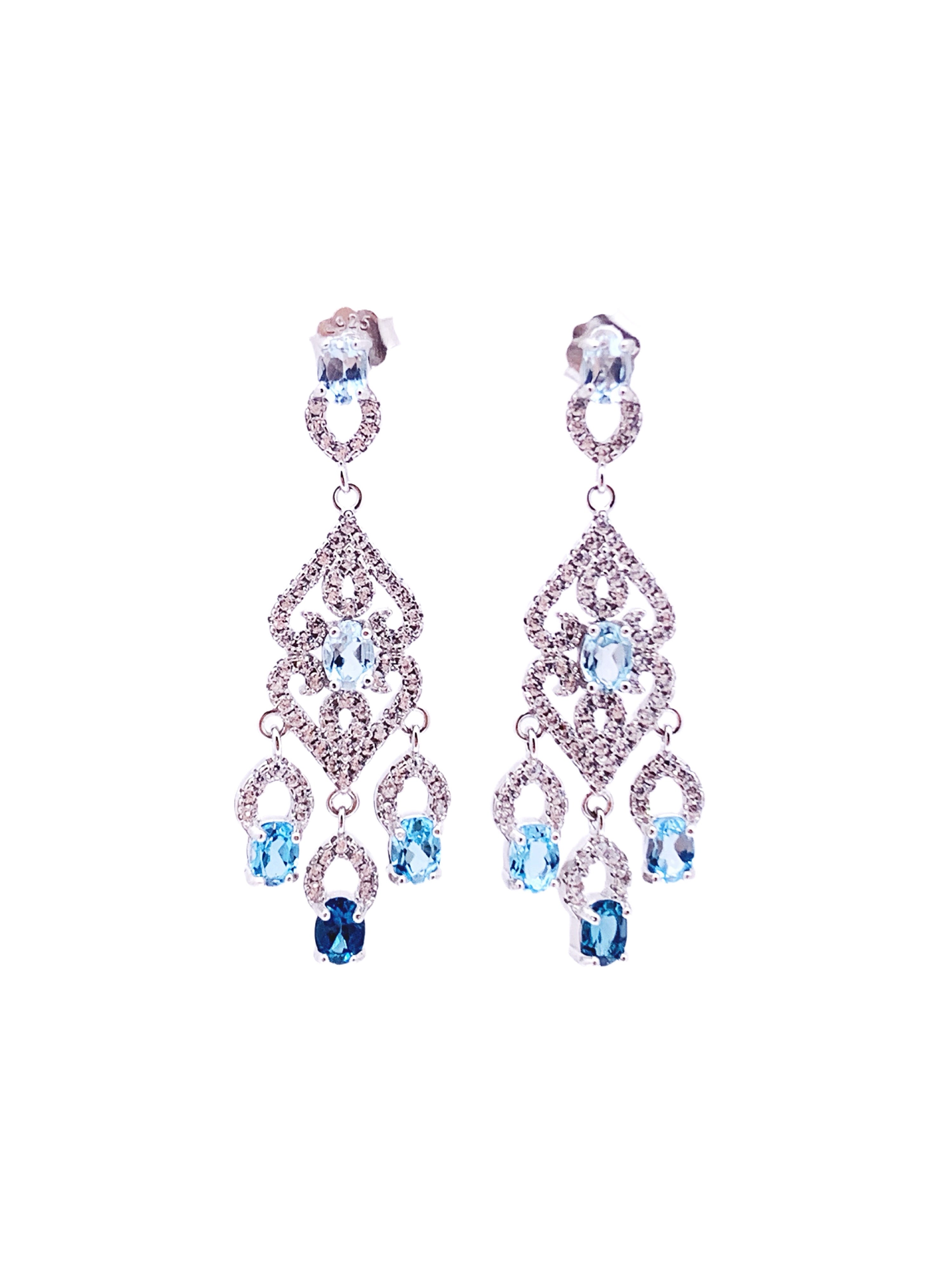 These elegant chandelier earrings feature intricate filigree detailing, with each element adorned in sparkling, pave-set stones. The earrings cascade gracefully, featuring light blue gemstones that provide a delicate pop of color, gradually darkening towards the bottom with deeper blue gems, adding depth and visual interest. The tiered design offers a vintage appeal while maintaining a timeless sophistication.
