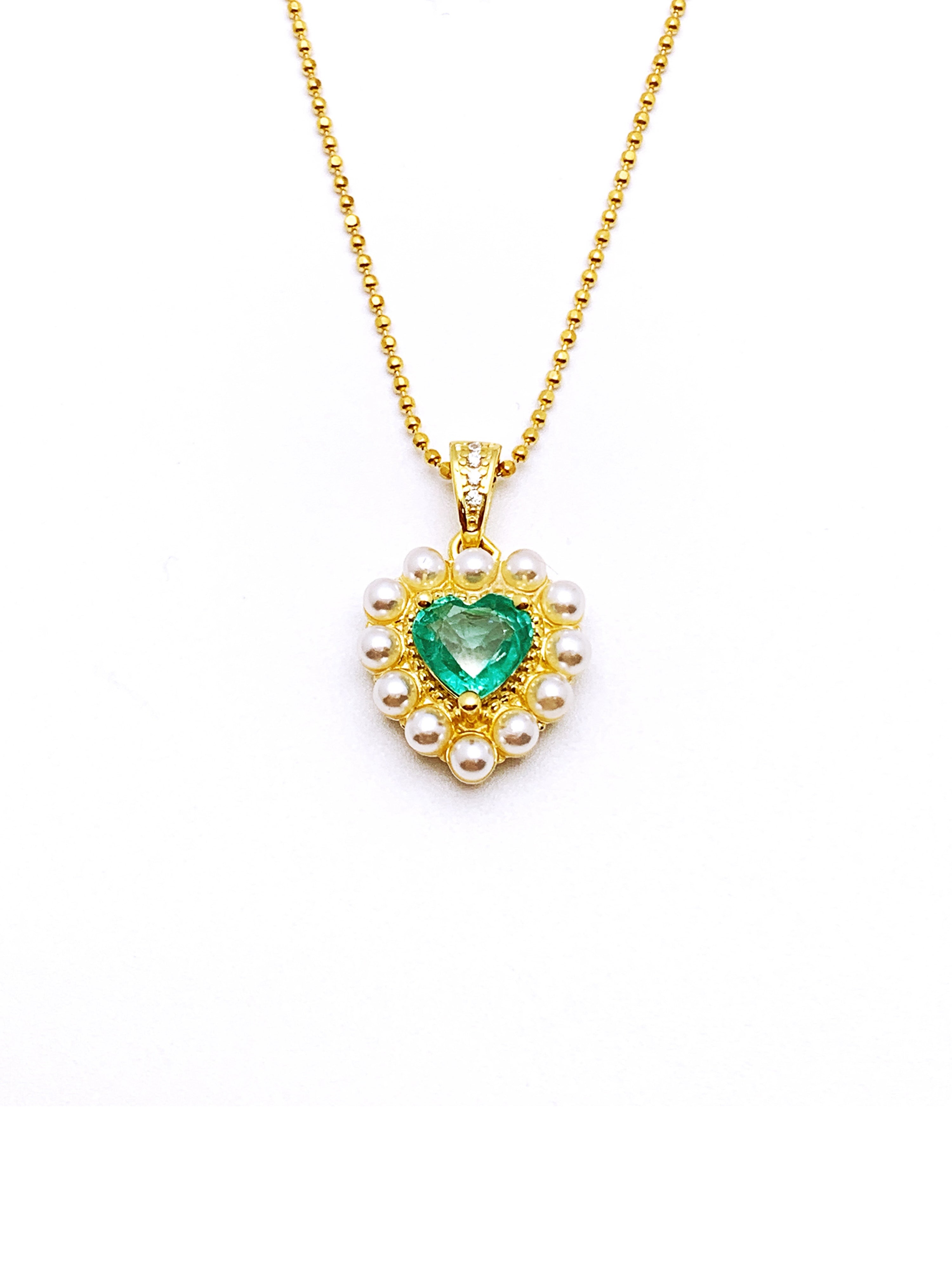 Amelia necklace features a delicate green heart adorned with elegant pearls, crafted to add a touch of sophistication to any outfit. Handmade by experts, this necklace is the perfect blend of style and quality.