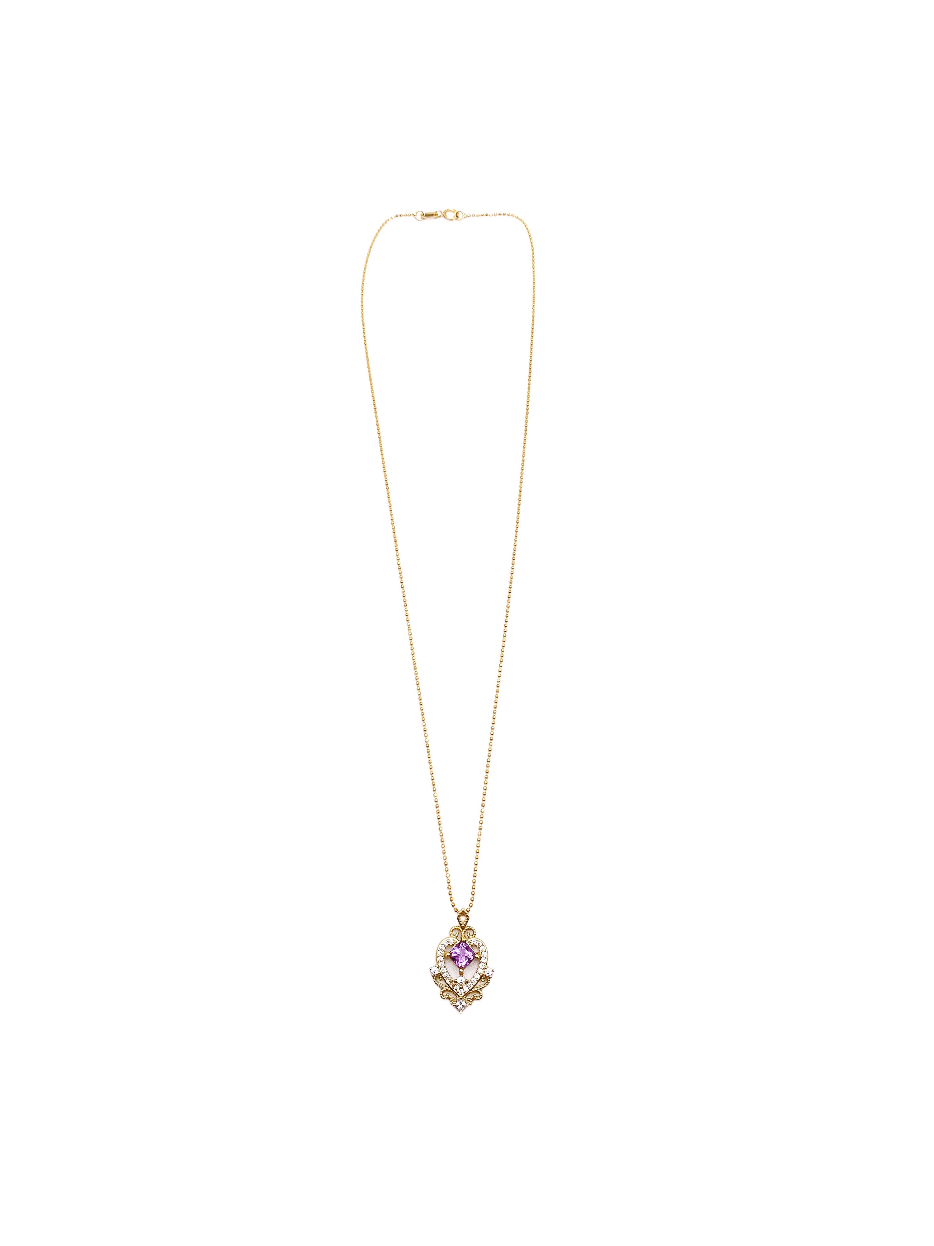 This exquisite pendant features a beautifully crafted heart design with intricate gold filigree details. At the center of the heart lies a radiant, cushion-cut amethyst gemstone, surrounded by a halo of sparkling diamonds that accentuate the elegant curves and vintage aesthetic of the piece. The delicate ball chain adds to the classic charm, making this pendant a true statement of sophistication.
