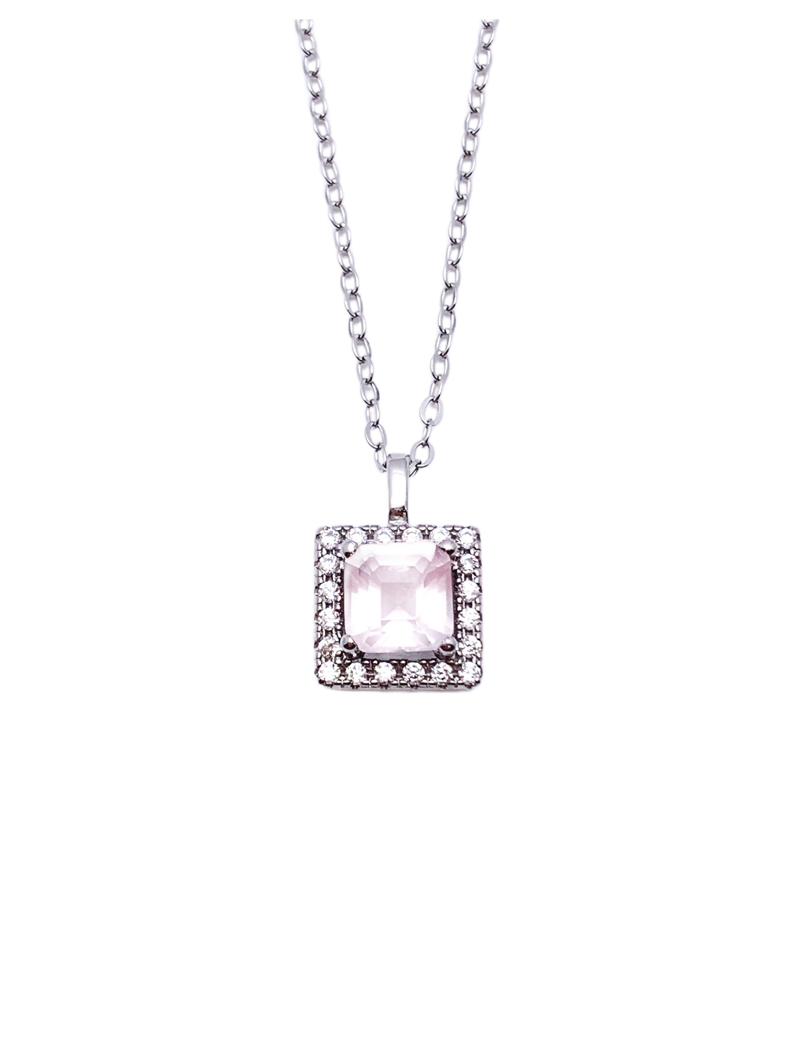 This elegant pendant features a soft pink, square-cut rose quartz gemstone set in a delicate silver or white gold prong setting. Surrounding the rose quartz is a halo of small, sparkling diamonds, enhancing its romantic and feminine appeal. The pendant hangs gracefully from a simple chain, allowing the pendant to be the focal point.
