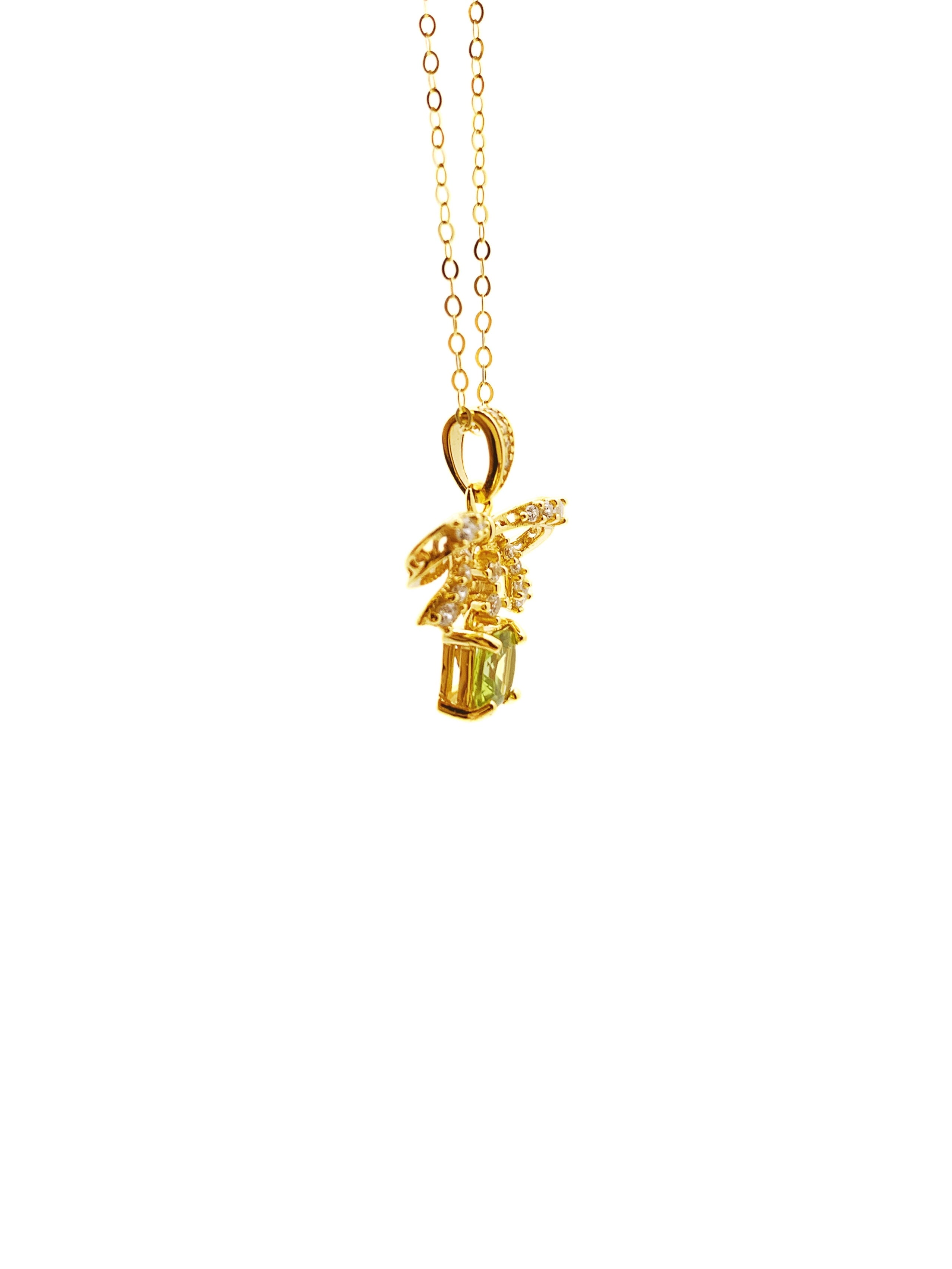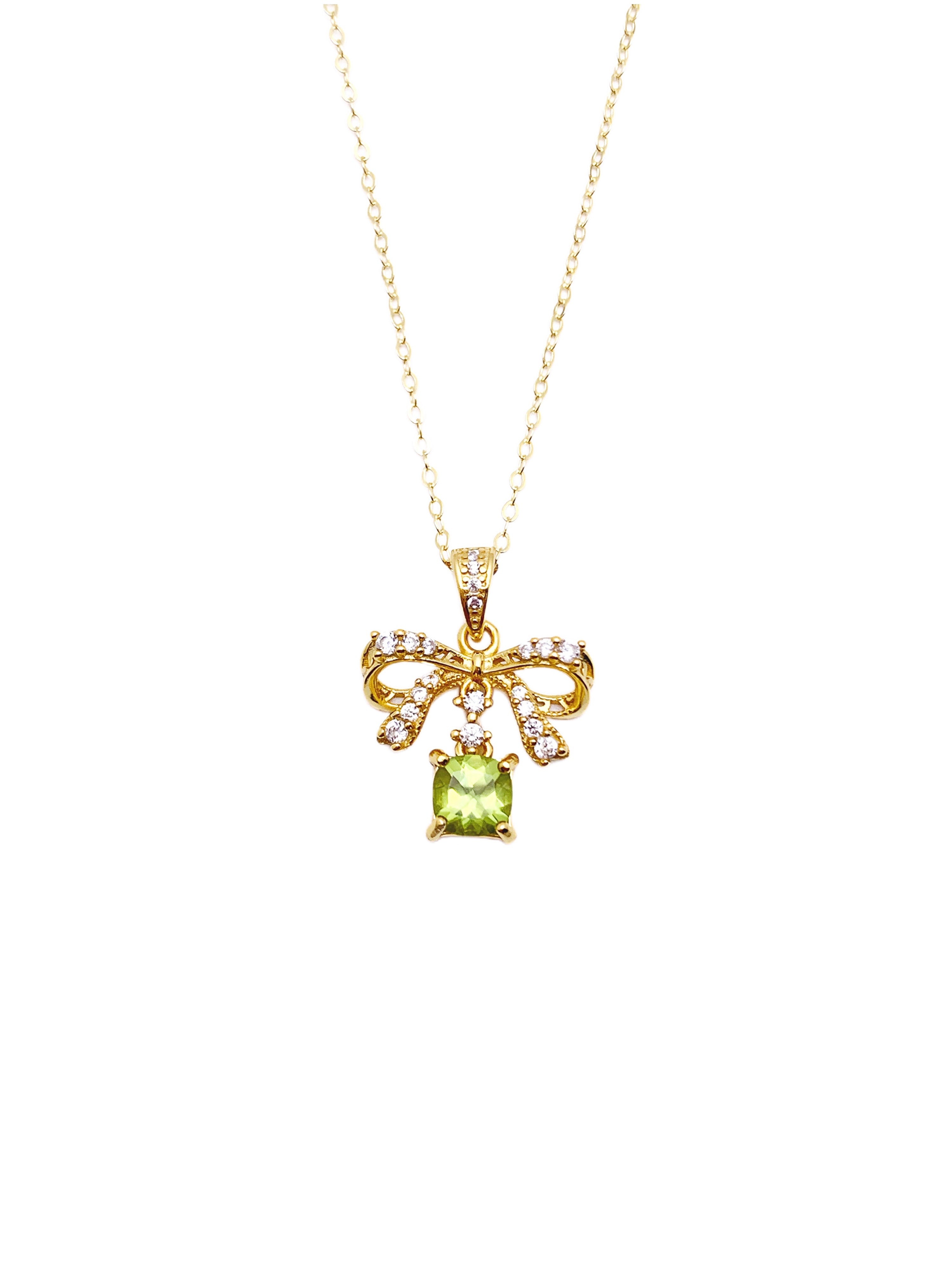 This delightful necklace showcases a graceful bow design, elegantly adorned with sparkling diamonds that give the pendant a sophisticated shimmer. Suspended from the bow is a square-cut green gemstone, adding a touch of color and charm. The bow, crafted in a warm gold tone, enhances the vibrancy of the gemstone, creating a striking and feminine piece.