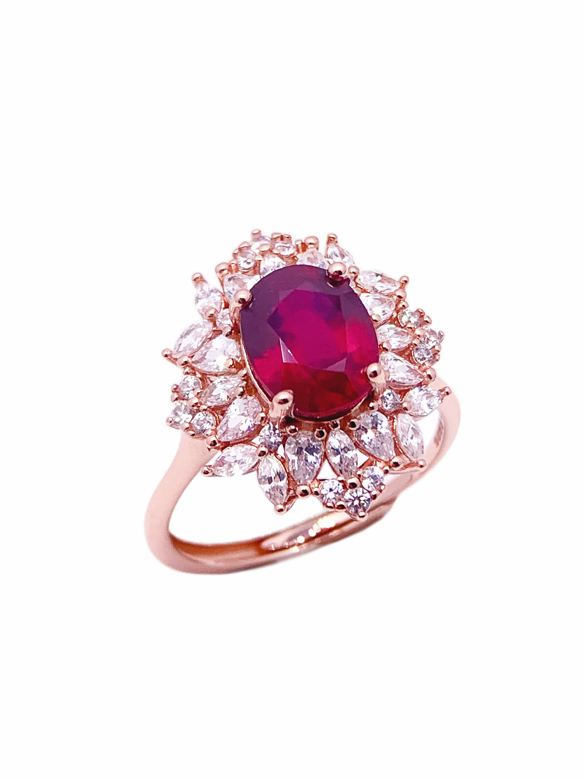 This breathtaking ring showcases an oval-cut ruby at its center, exuding deep, passionate red hues that symbolize love and vitality. The ruby is surrounded by a spectacular halo of marquise and round-cut diamonds, forming an opulent cluster design reminiscent of royal jewelry. Set in rose gold, the combination of the warm metal with the striking ruby and brilliant diamonds creates an elegant contrast, making this ring a true statement piece. Perfect for those who appreciate timeless beauty and luxurious style, this ring is crafted to leave a lasting impression.