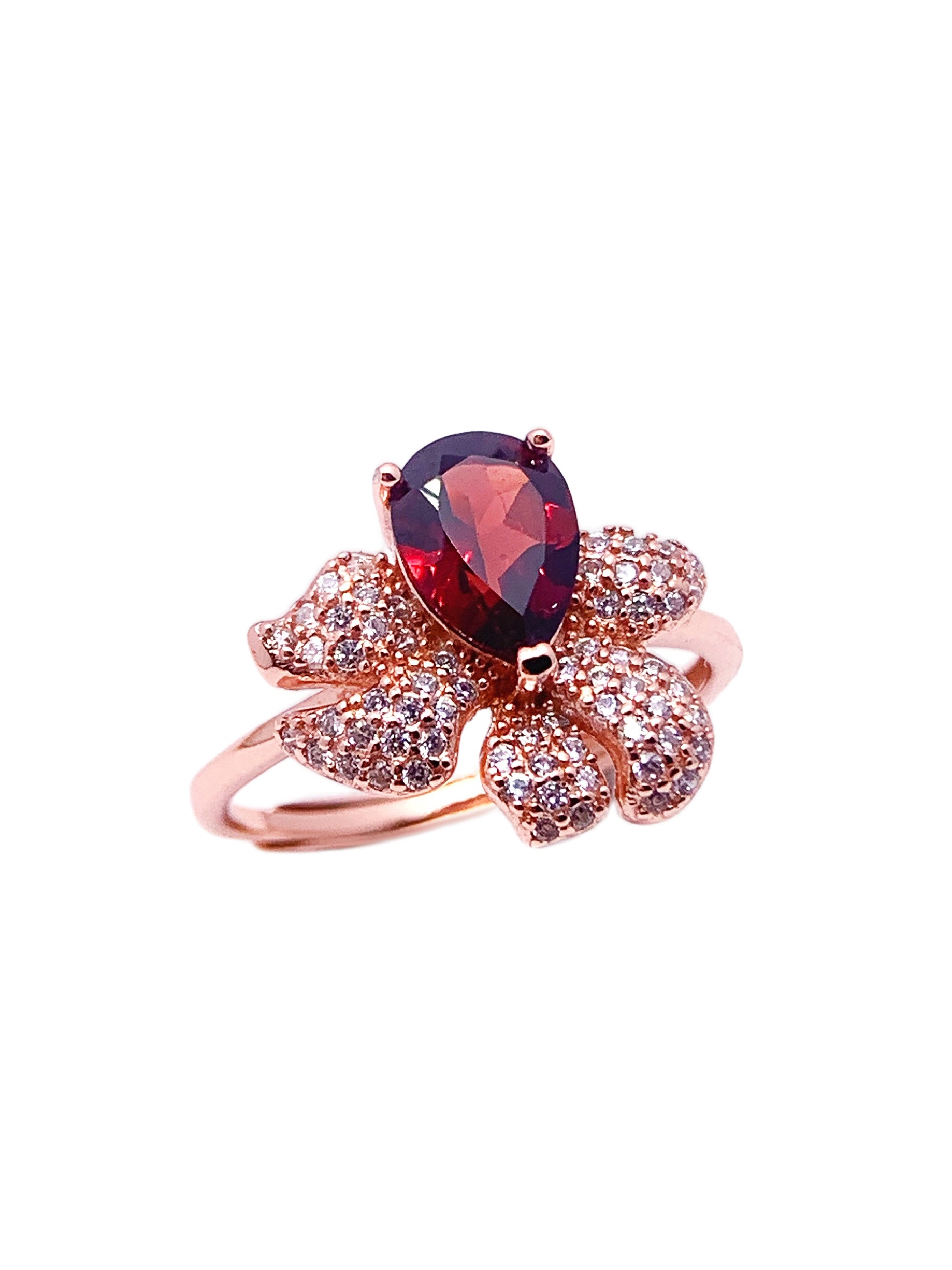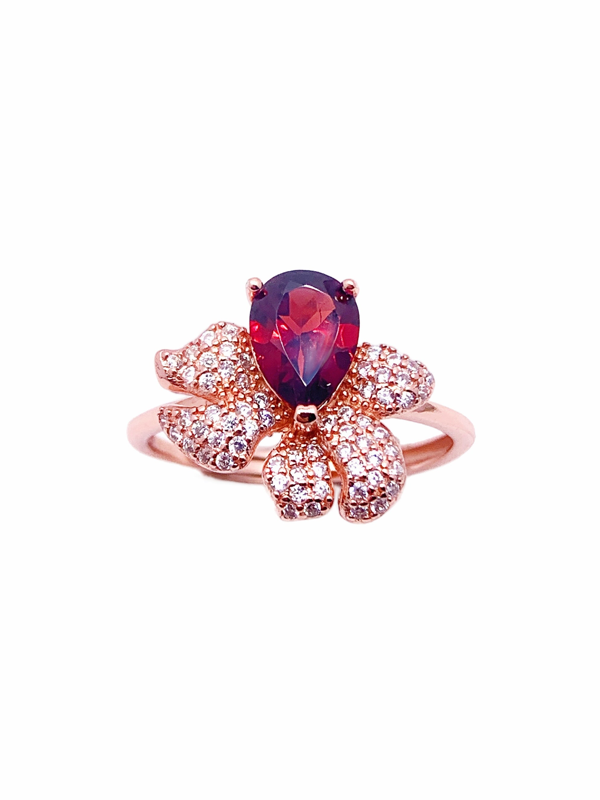 This enchanting ring captures the beauty of nature with a teardrop-cut garnet as its centerpiece, glowing with rich, deep red tones that symbolize passion and vitality. The garnet sits atop a unique floral-inspired setting, where each petal is beautifully encrusted with pavé diamonds, creating a shimmering blossom effect. Crafted in rose gold, this ring combines the warm blush of the metal with the vibrant garnet and sparkling diamonds, offering a look that is both bold and elegant. Perfect for those who love unique designs with a romantic touch.