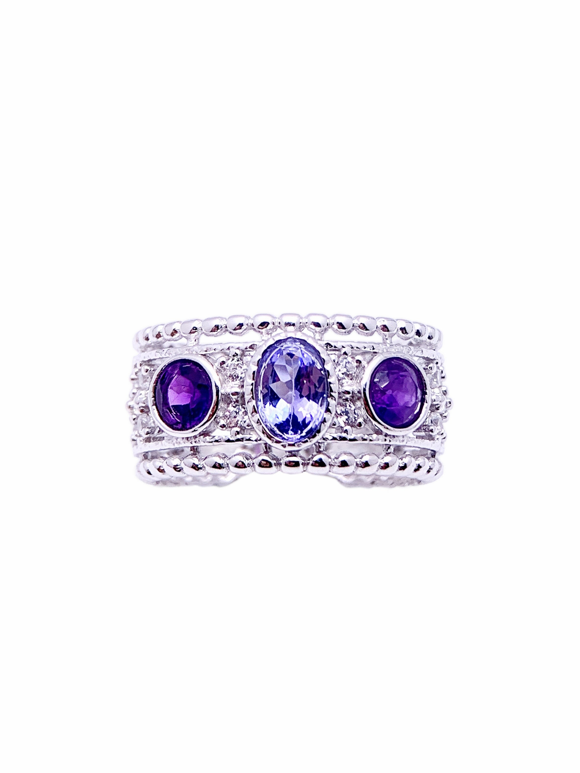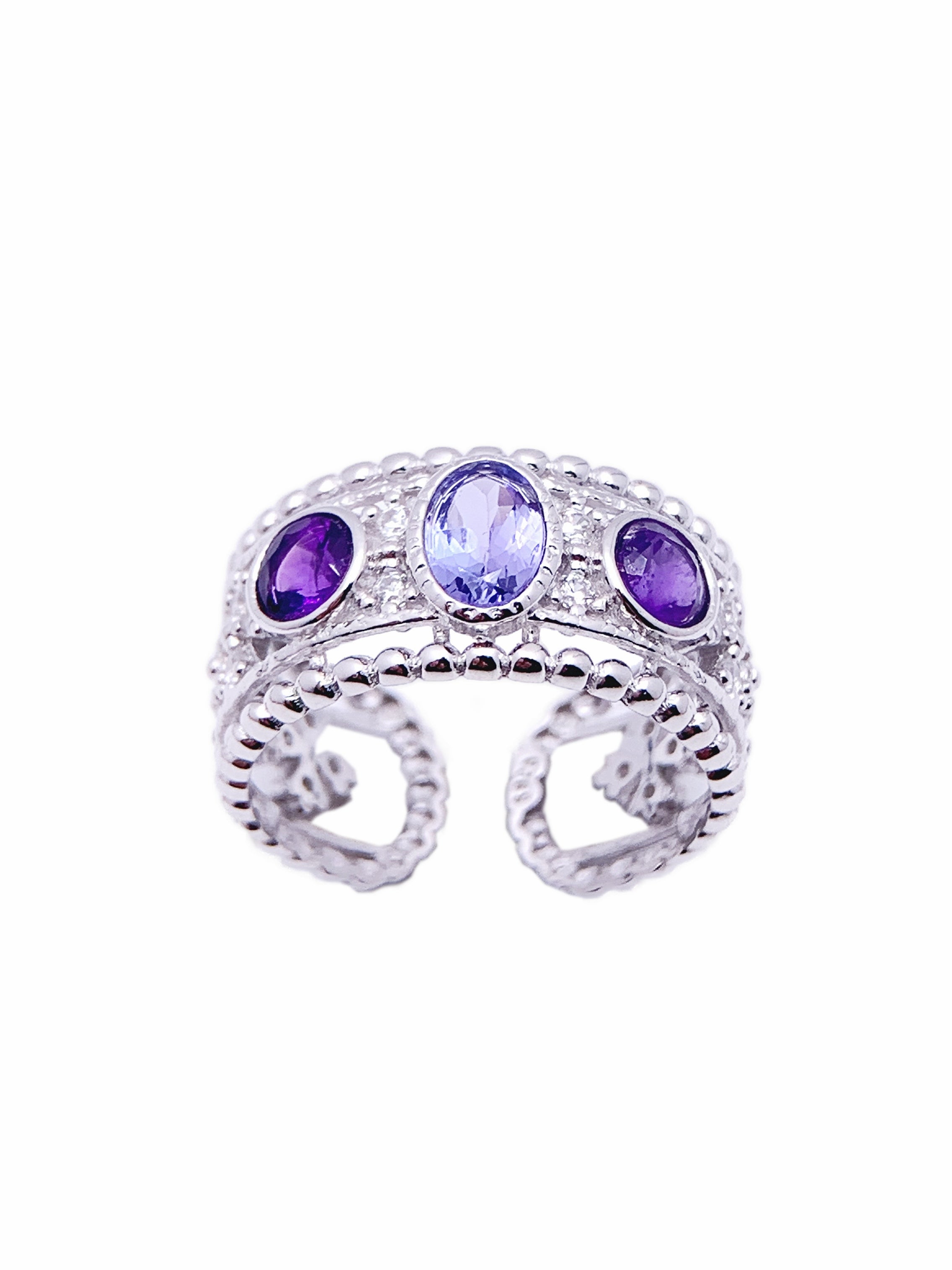This distinctive band ring combines elegance and boldness with its trio of captivating gemstones set in luxurious sterling silver. The central stone, a faceted tanzanite, radiates a brilliant blue-violet hue, flanked by deep purple amethysts on either side. Each gemstone is securely bezel-set, accentuated by intricate beaded details along the band for added texture and charm. This ring’s wide design and rich color contrast make it perfect for those who appreciate unique, eye-catching pieces with a vintage flair.