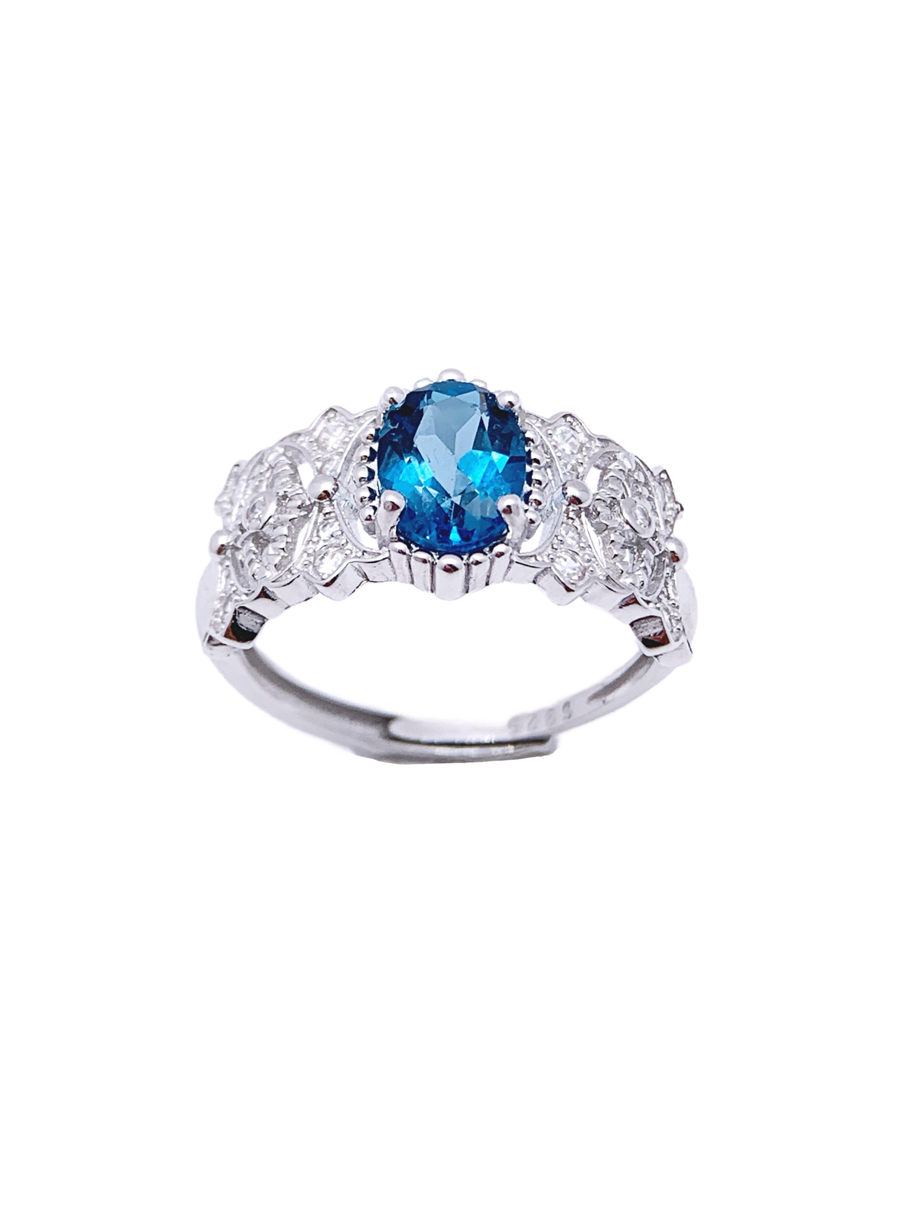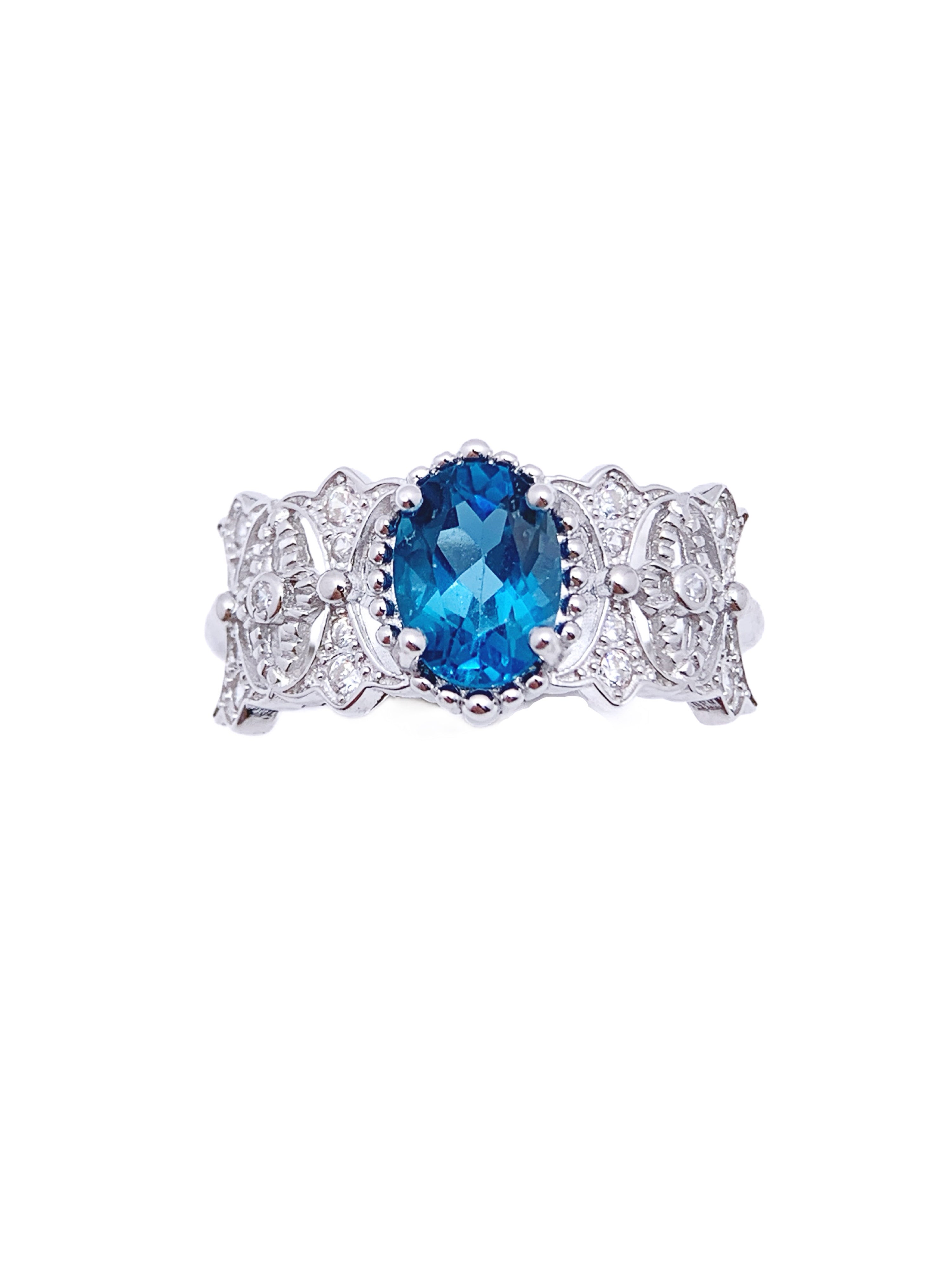 This exquisite band ring showcases an oval-cut blue topaz at its center, radiating a vivid blue that brings depth and elegance. The topaz is set in an intricate, vintage-inspired band adorned with delicate filigree details and sparkling diamond accents. Crafted from S925 sterling silver, this ring combines antique charm with modern luxury. Perfect for those who appreciate unique, statement jewelry, this piece makes a beautiful addition to any collection.