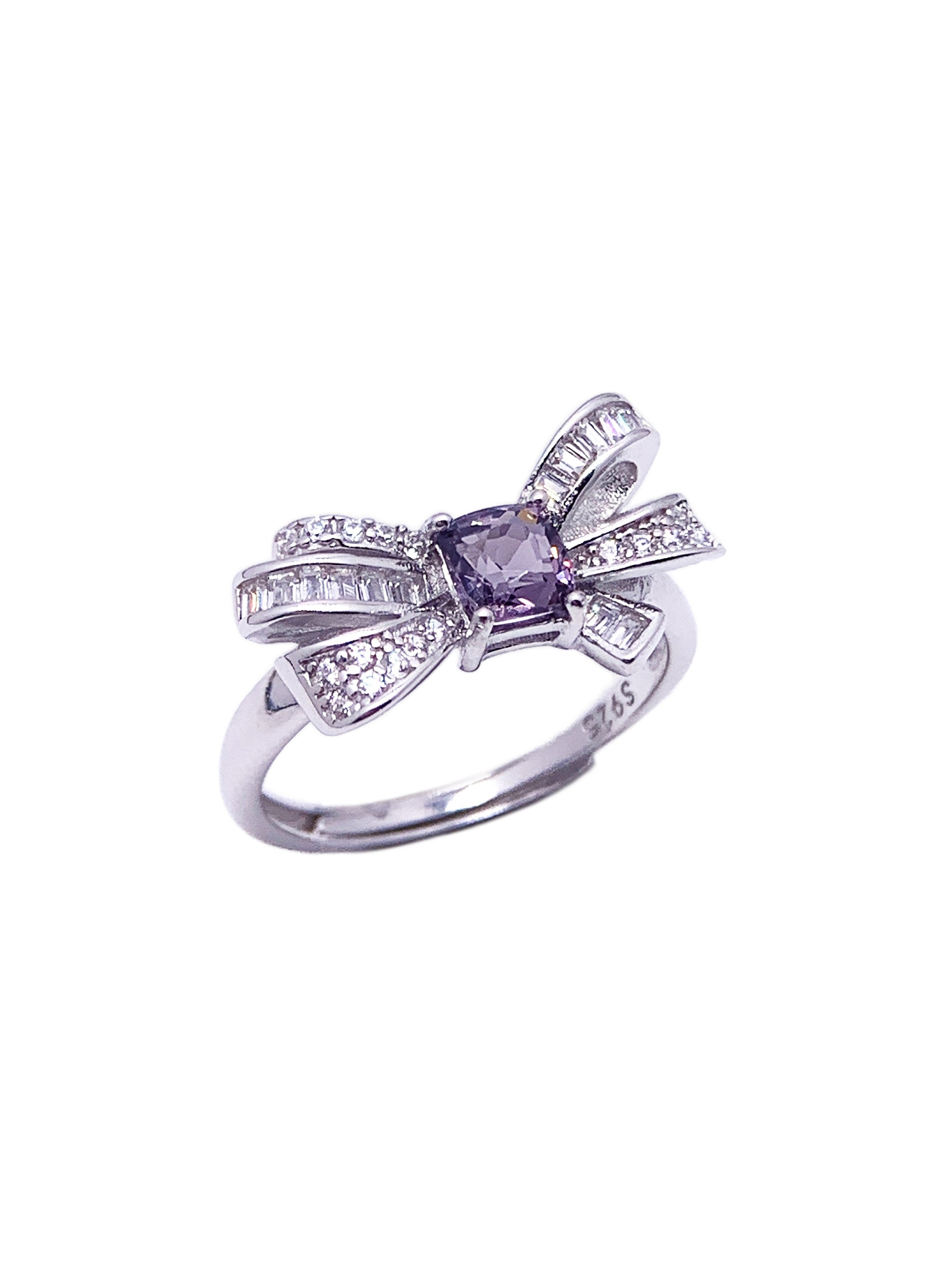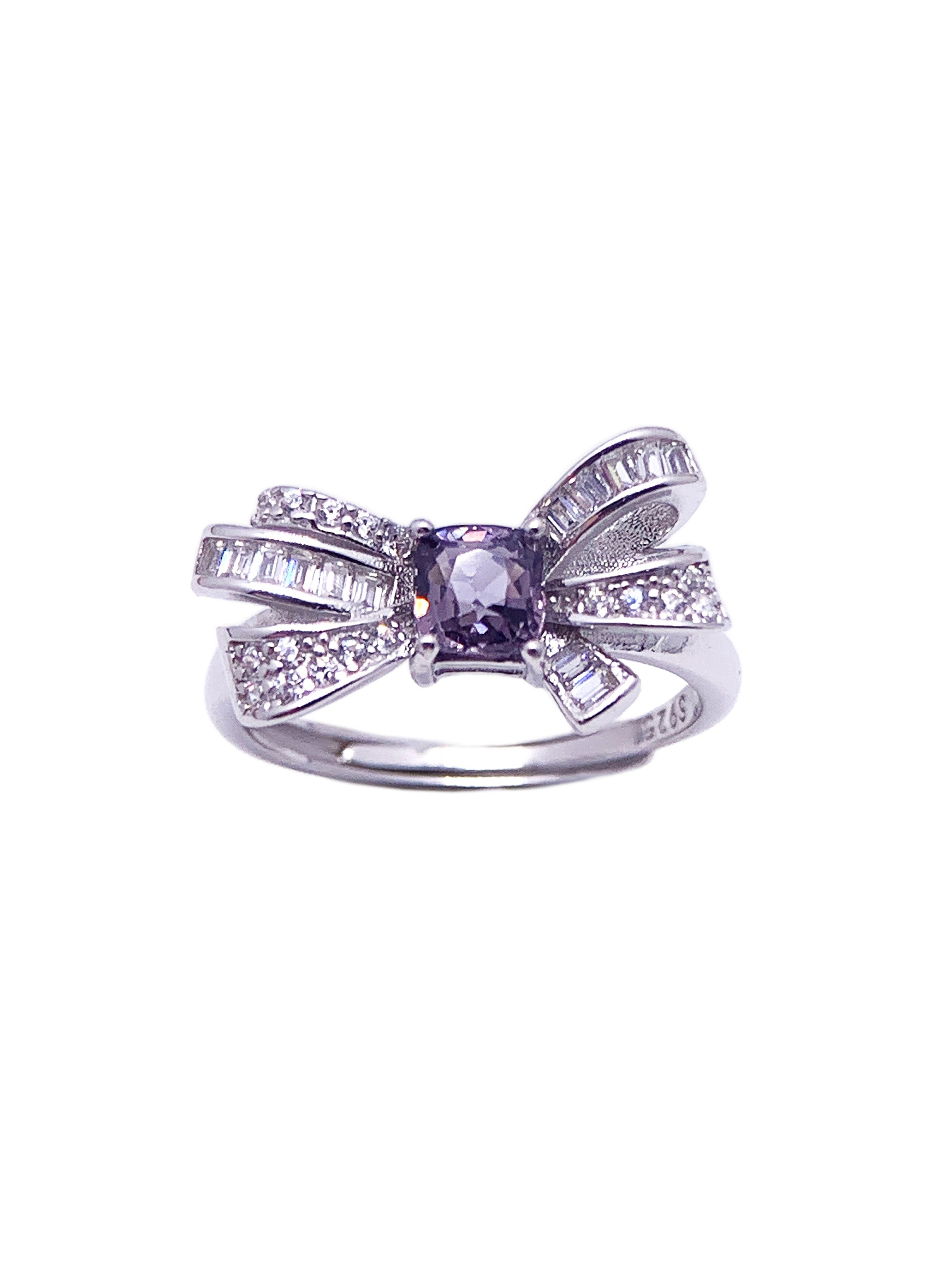 This elegant ring features a captivating cushion-cut alexandrite at its center, known for its mesmerizing color-changing properties, shifting from purple to green under different lighting. The alexandrite is embraced by a unique bow design, adorned with baguette and round-cut diamonds that add a touch of sparkle and sophistication. Set in high-polish sterling silver, this ring exudes both charm and luxury, making it a perfect choice for those who appreciate distinctive, whimsical designs.
