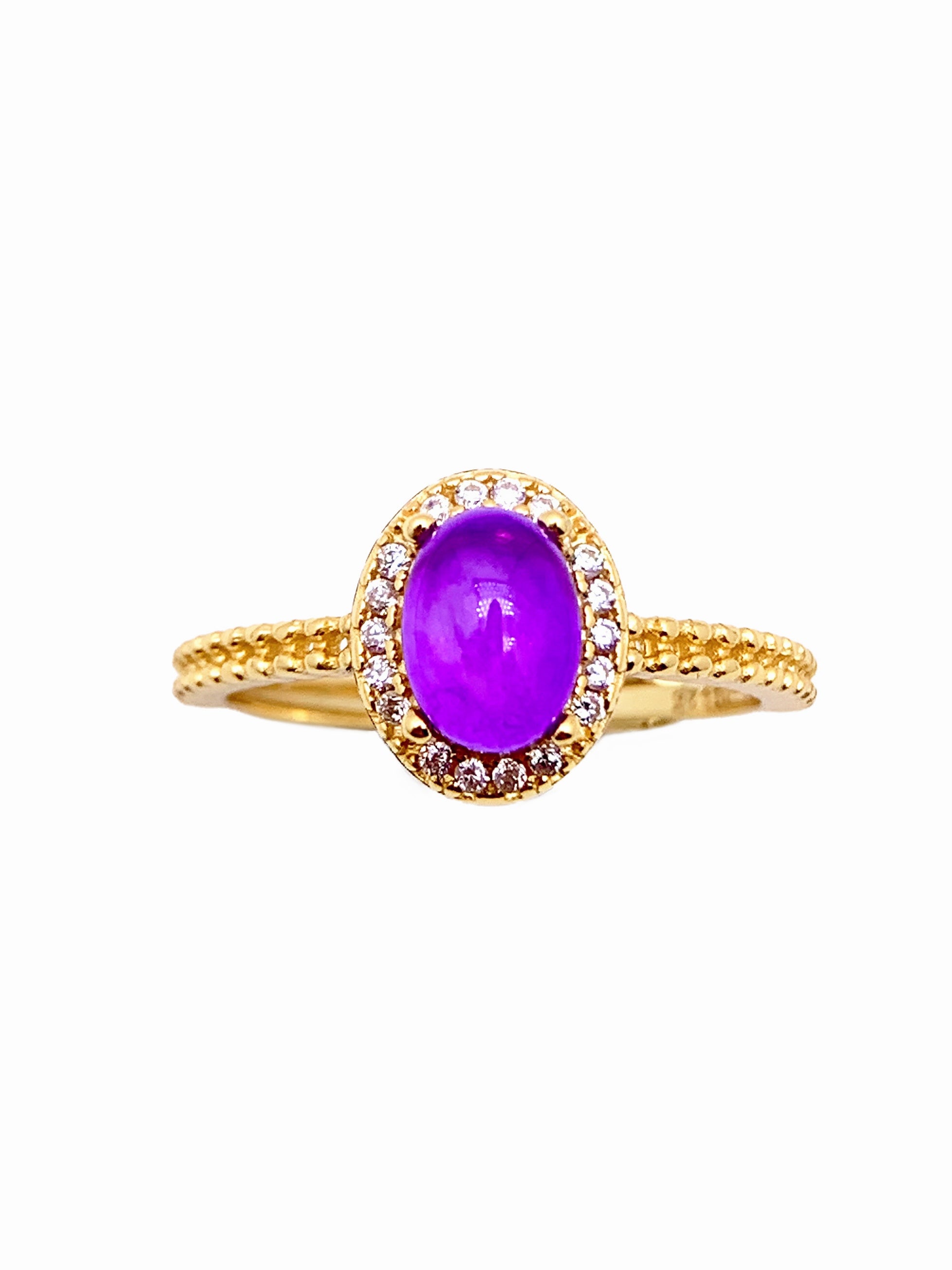 This enchanting ring showcases a beautiful oval cabochon amethyst, exuding a vivid purple hue that symbolizes calm and creativity. The amethyst is encircled by a delicate halo of sparkling diamonds, enhancing its vibrant color and adding a touch of luxury. Set in a gold band with a beaded texture, this ring combines classic elegance with a modern twist. Perfect for both everyday wear and special occasions, this piece is designed to bring a touch of sophistication to any outfit.