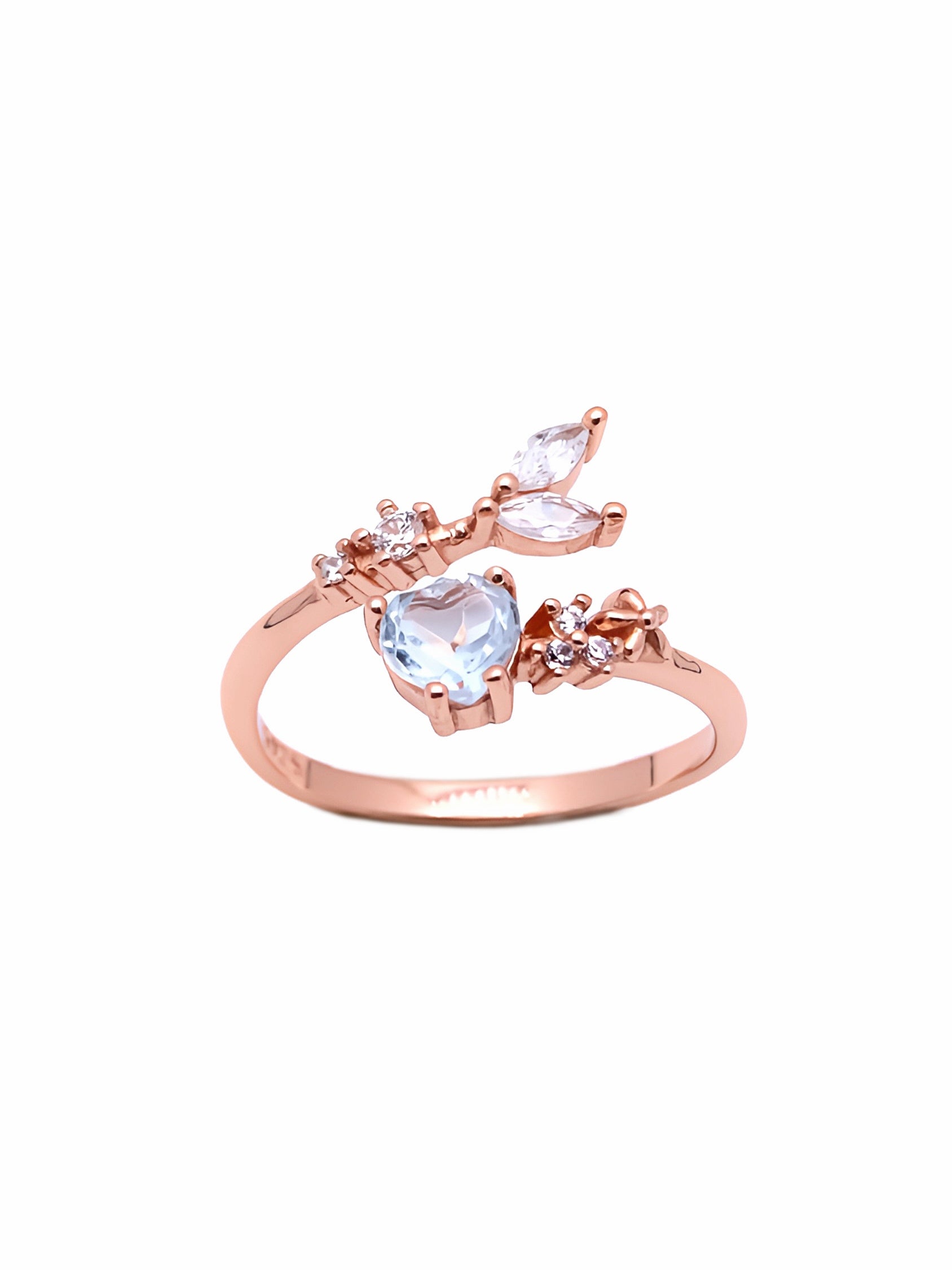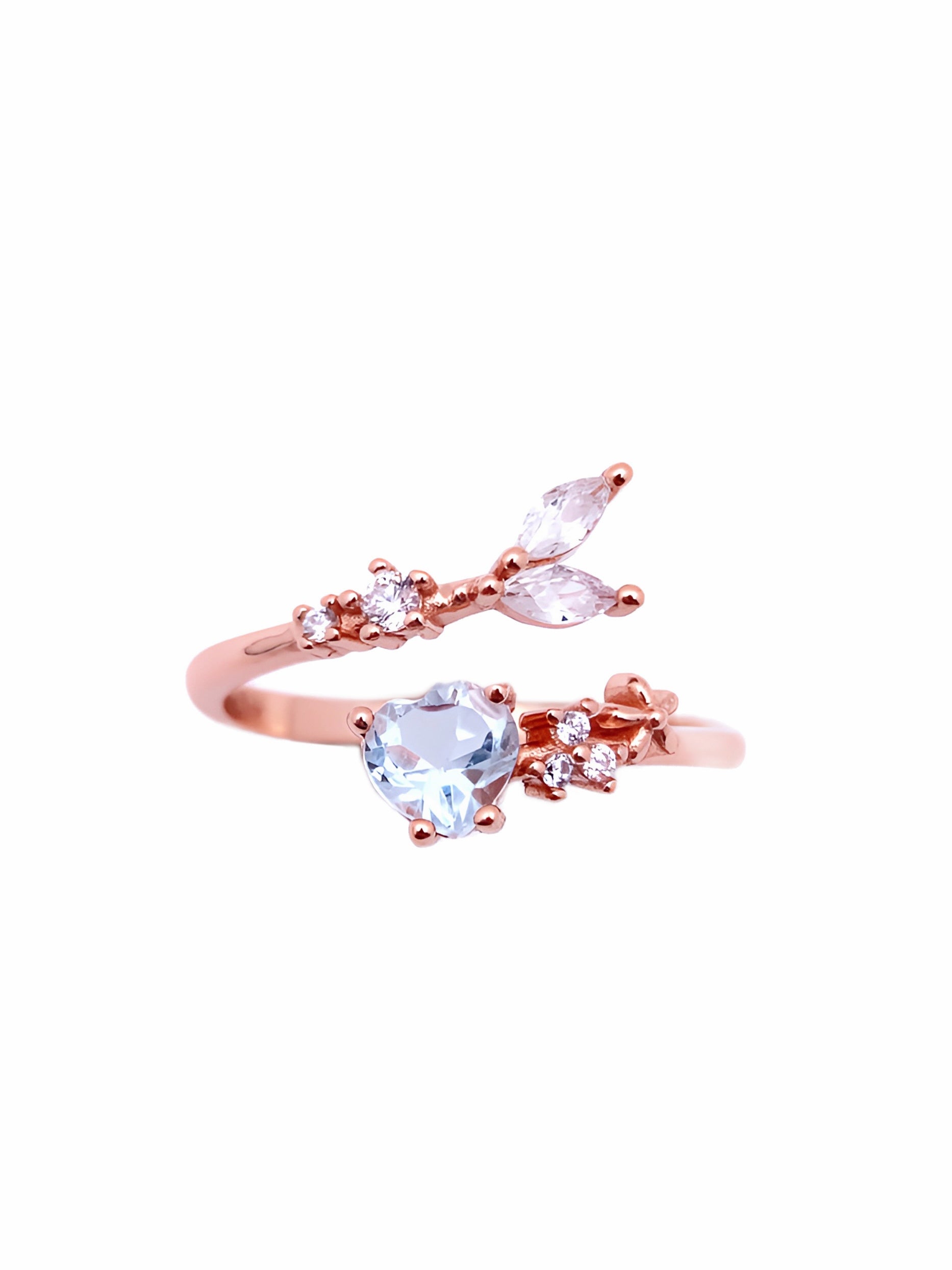 Embrace the beauty of nature with this enchanting ring, featuring a delicate heart-shaped crystal that symbolizes love and serenity. The crystal is set in a rose gold band, designed with intricate branch and leaf motifs adorned with sparkling diamonds. The open band style enhances the organic flow of the design, making this ring perfect for those who love unique, nature-inspired jewelry with a touch of romance.