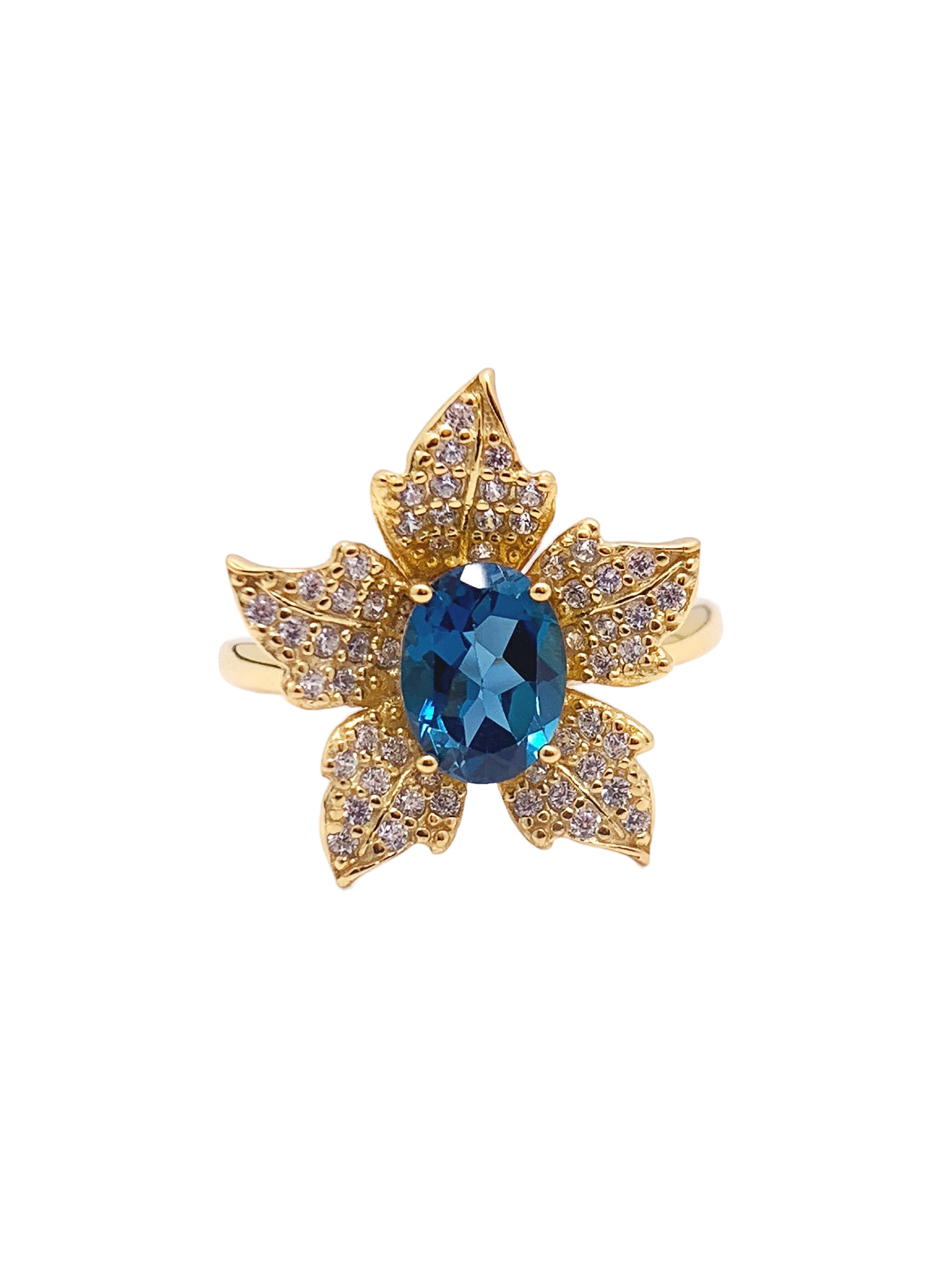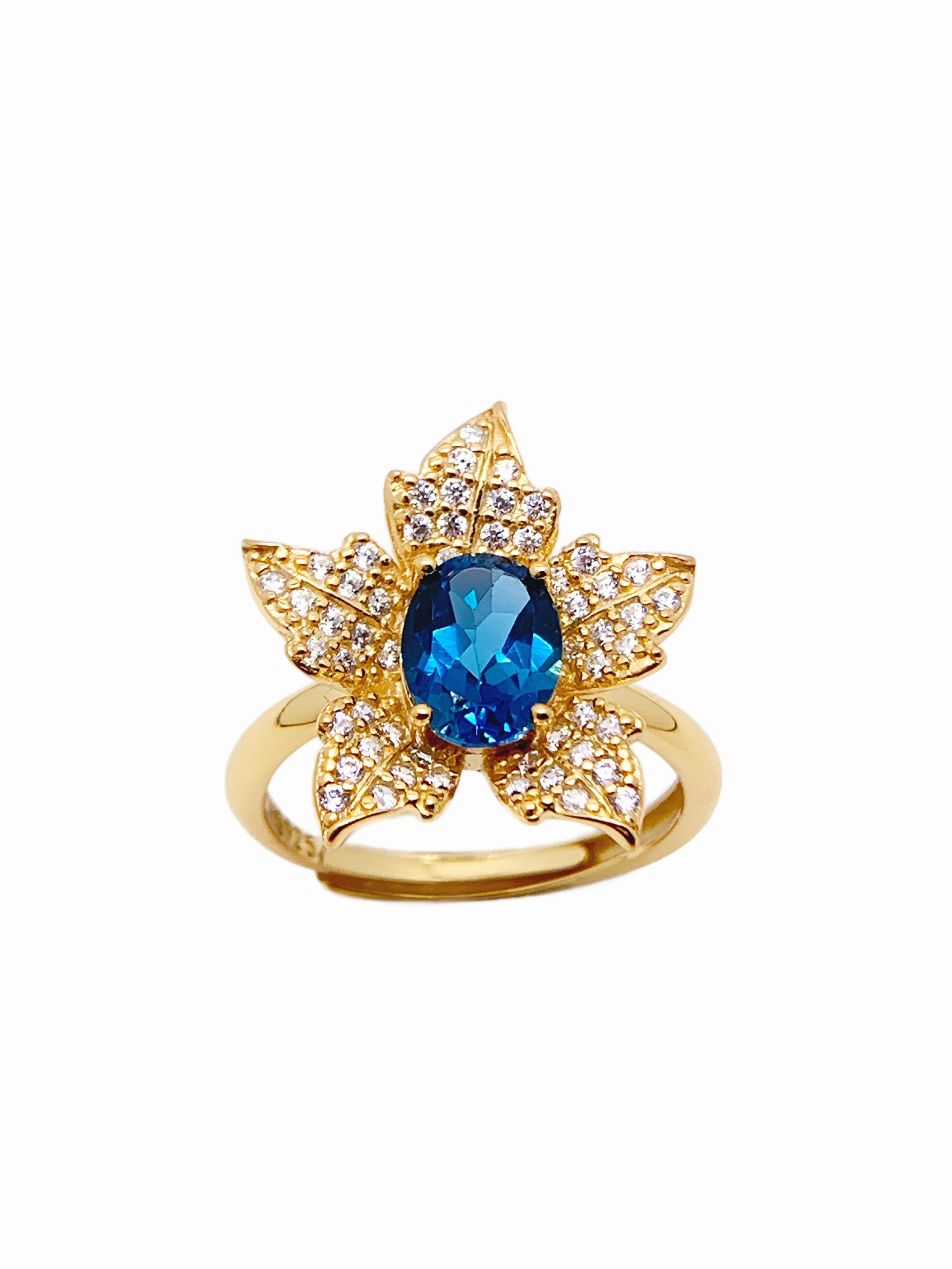 Make a bold statement with this enchanting gold-plated ring featuring a vibrant blue sapphire centerpiece set within a unique, leaf-inspired design. Each leaf is adorned with sparkling crystals, accentuating the ring's natural elegance and adding a touch of sophistication. The intricate detailing on the gold-plated leaves beautifully complements the deep blue of the sapphire, creating a harmonious blend of color and shine.