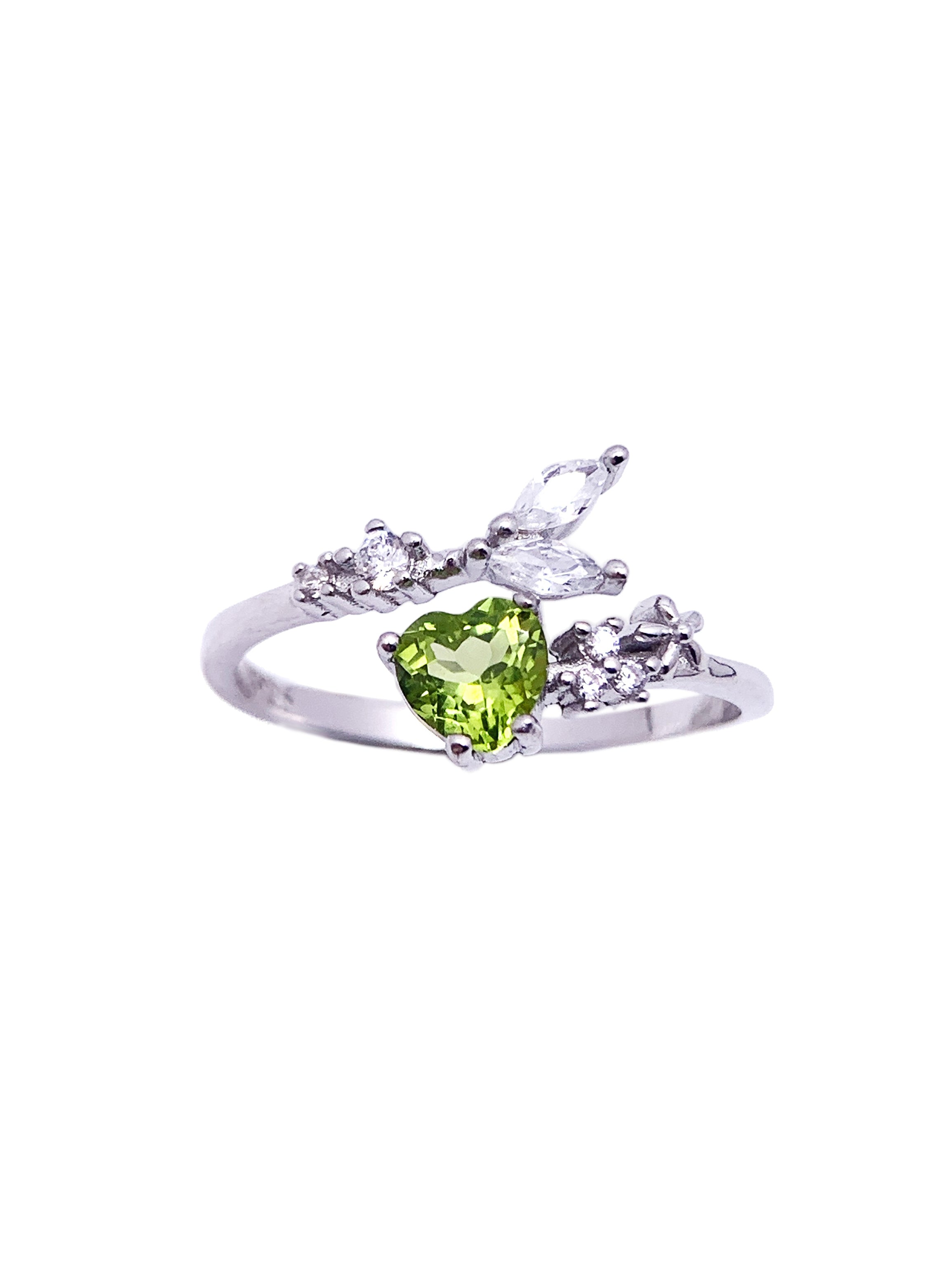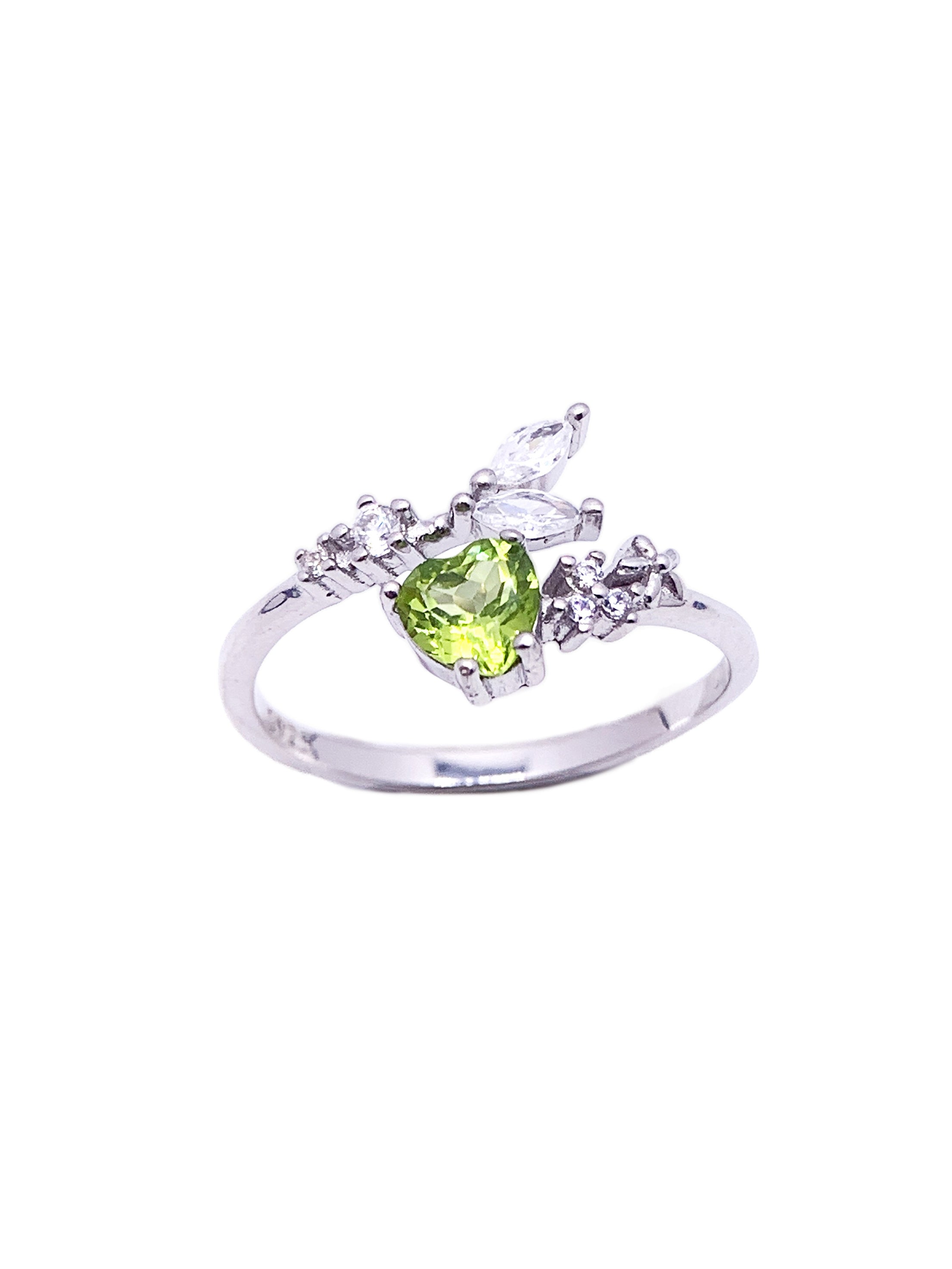 This delicate ring showcases a lovely green heart-shaped gemstone as its focal point, set in silver plating. The design is enhanced by small, leaf-like clear stones along the band, creating a nature-inspired, whimsical look. The asymmetrical arrangement of the stones adds a unique touch, making this ring both playful and elegant.