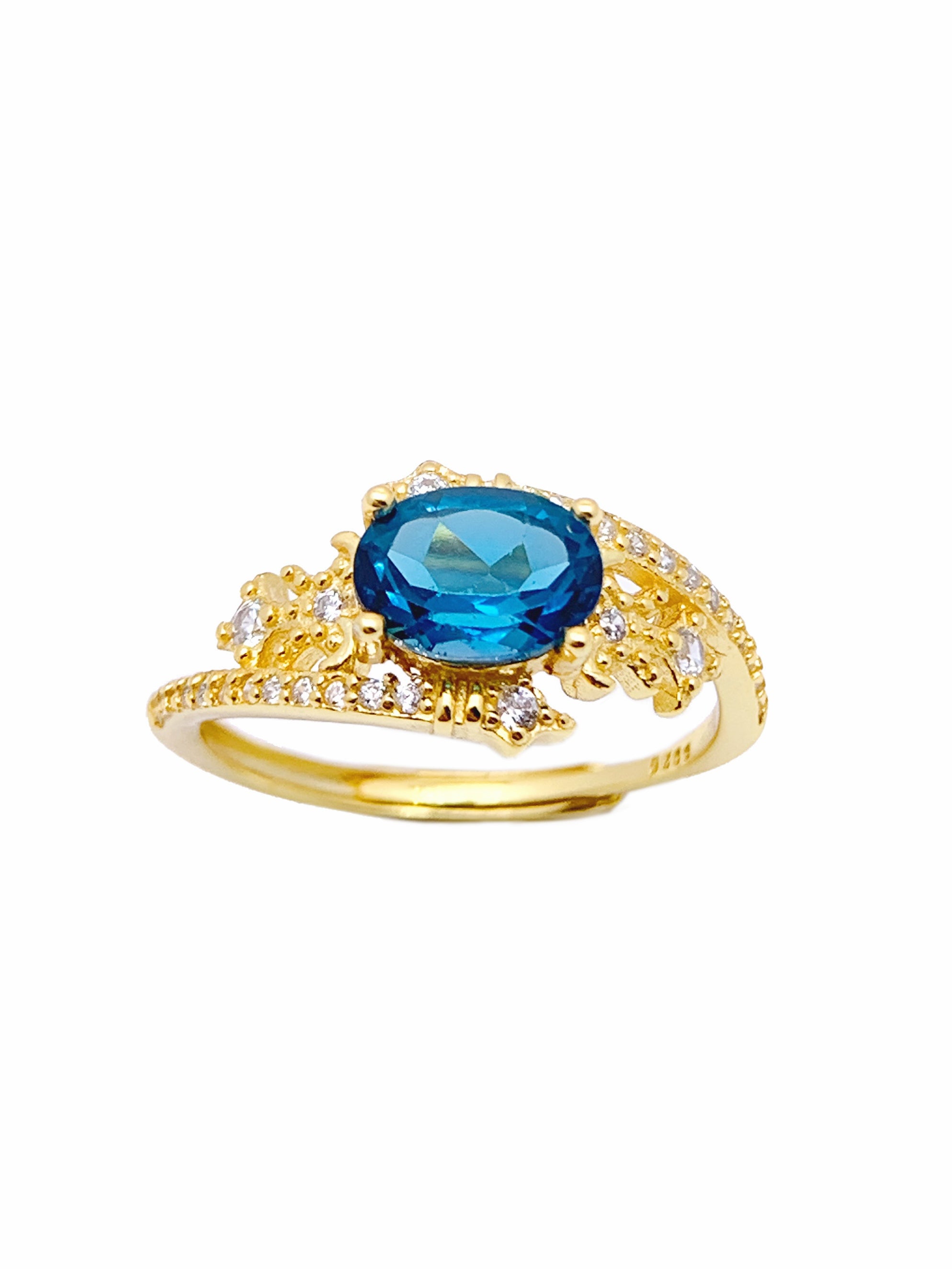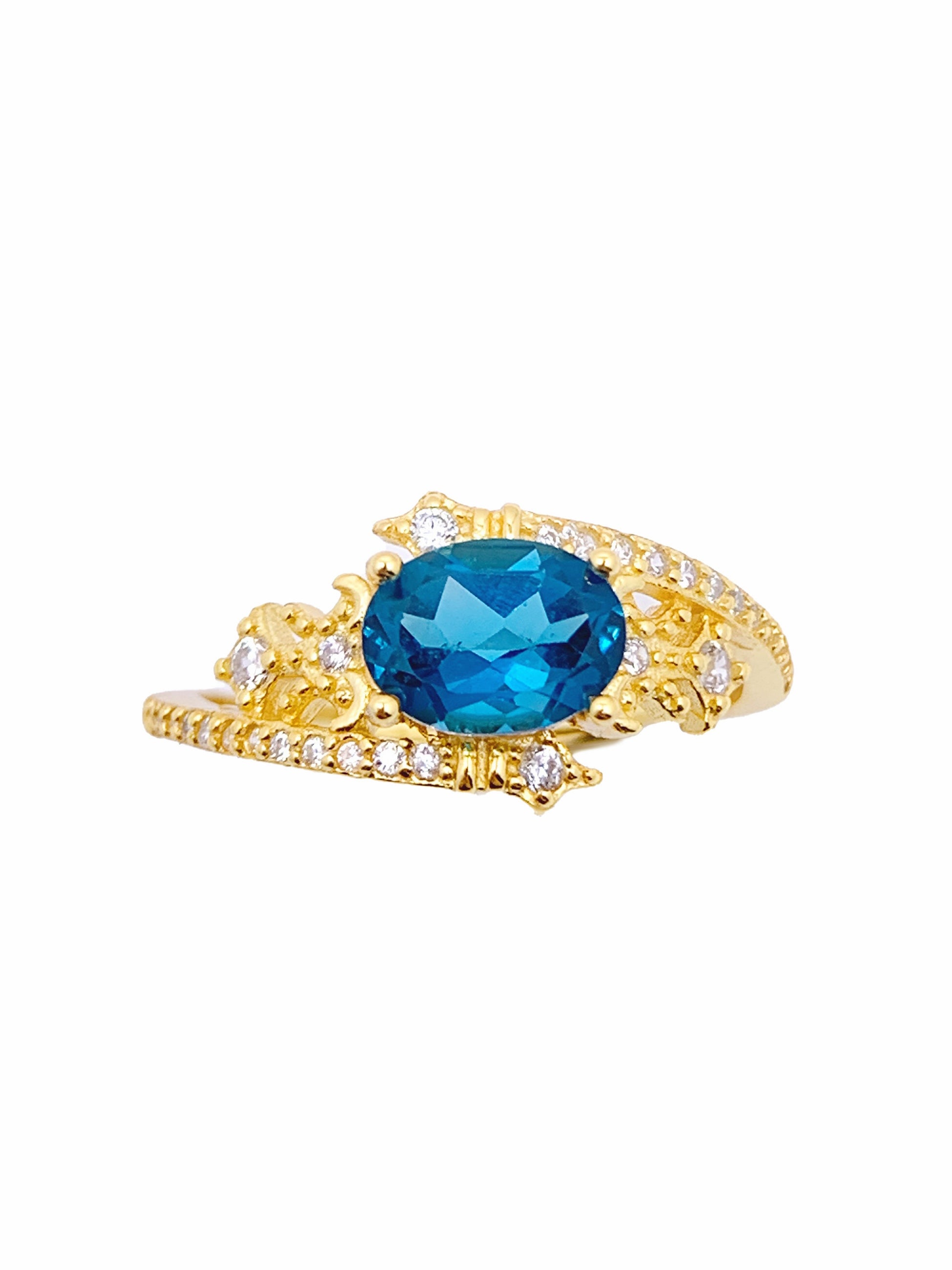 This striking ring features a deep blue oval gemstone set in a luxurious gold-plated band. The band is adorned with intricate filigree accents and small, sparkling clear stones, creating an ornate, vintage-inspired look. The band’s asymmetrical design enhances its uniqueness, giving it a regal and eye-catching appearance.