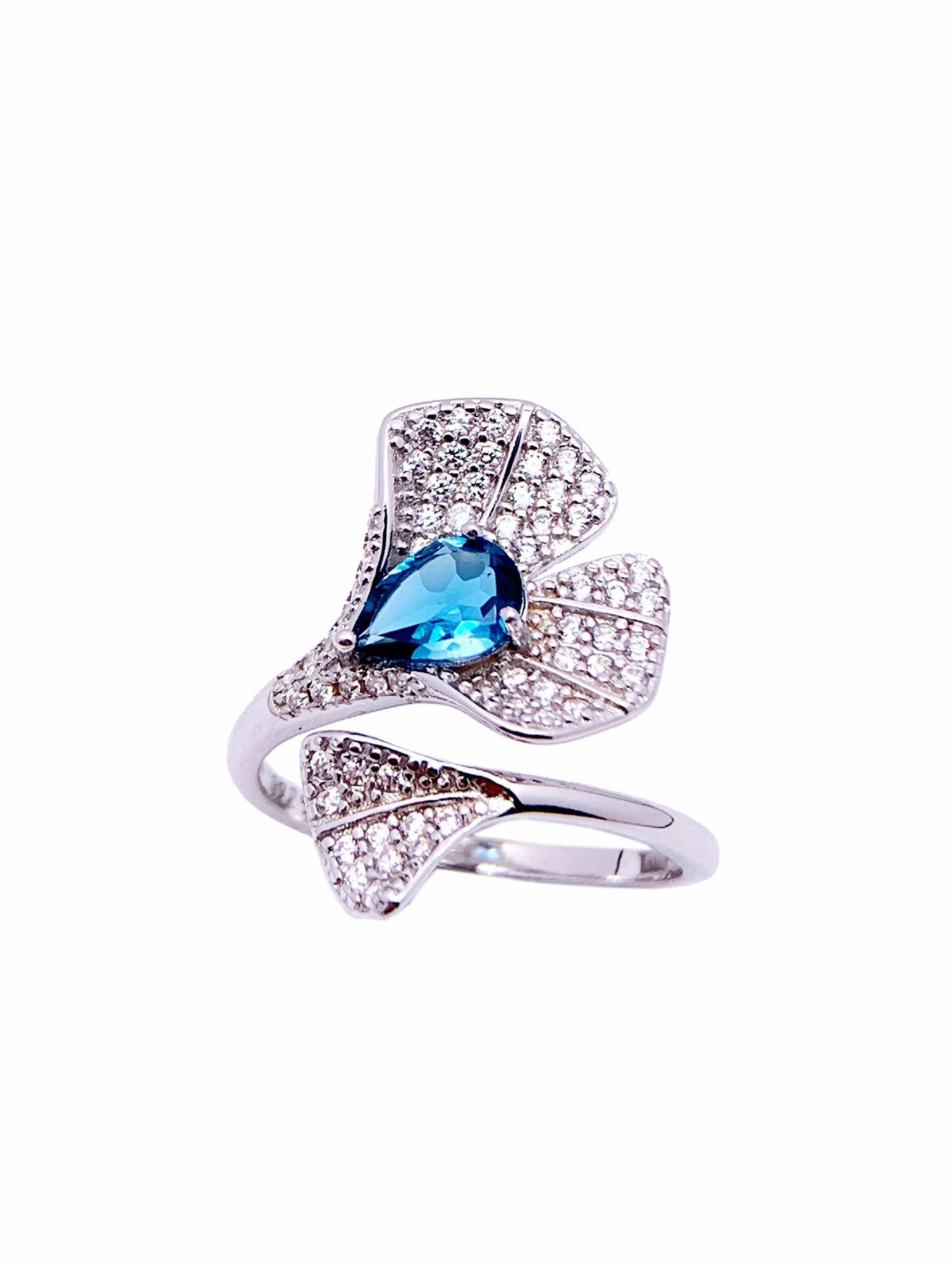 This elegant ring features a striking blue teardrop gemstone, carefully set in a silver-plated band. The design mimics delicate leaves, each embellished with sparkling clear stones for a dazzling effect. The open-band style adds a modern twist to this nature-inspired piece, making it both versatile and unique.