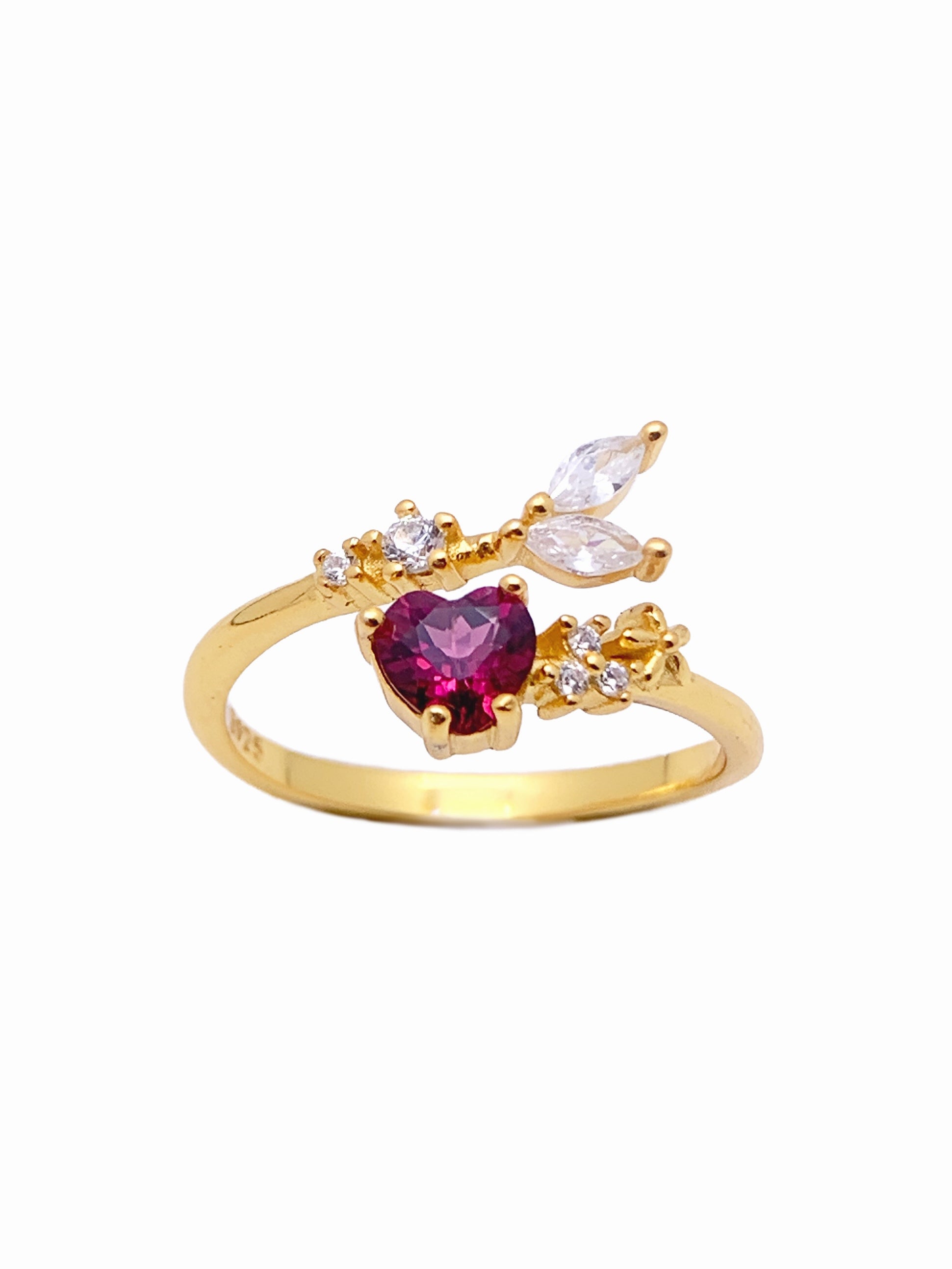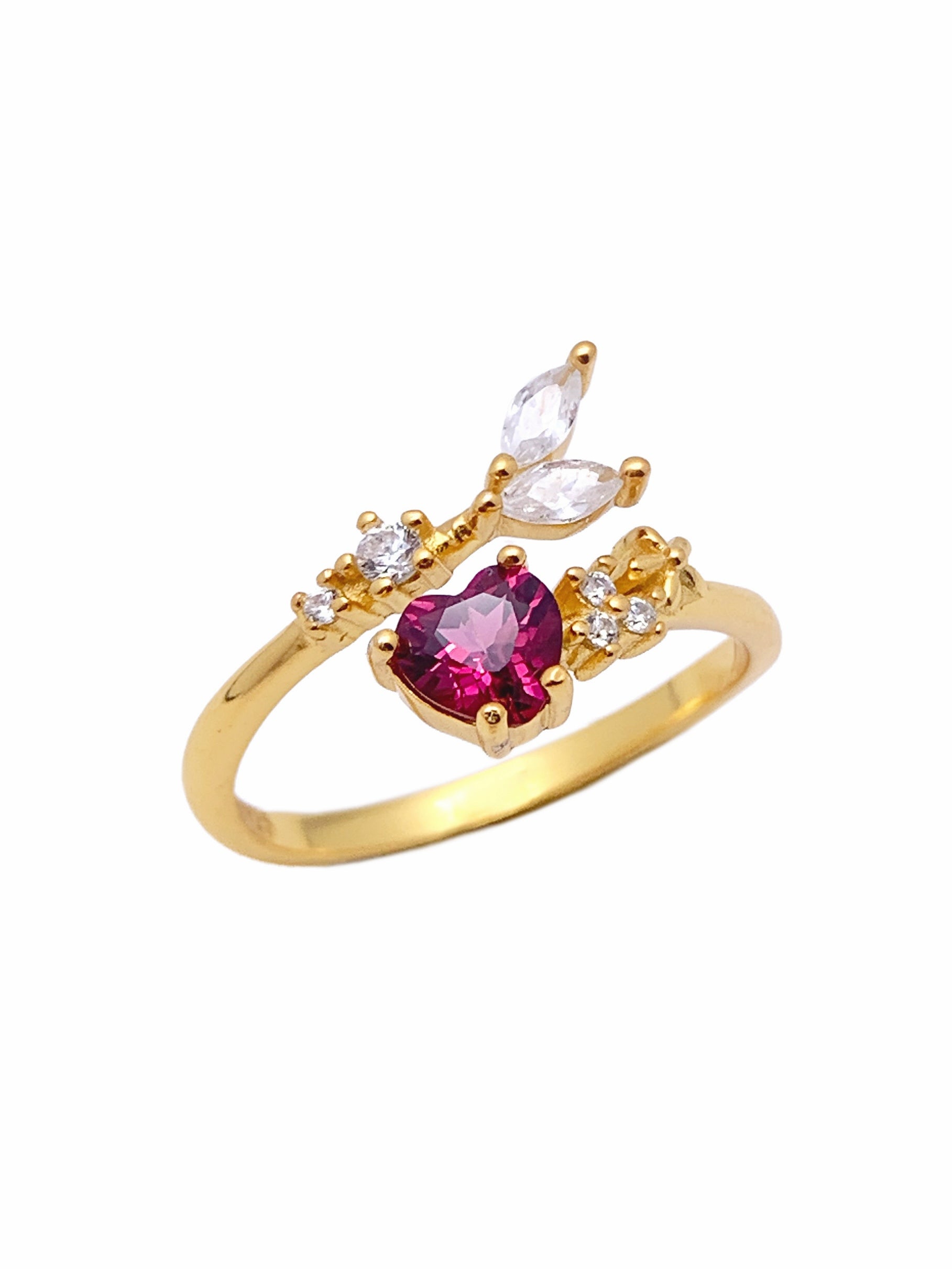 This charming ring showcases a vivid, heart-shaped ruby at its center, symbolizing love and passion. The ruby is accentuated by delicate, nature-inspired detailing on a gold band. Sparkling marquise and round-cut stones form a leaf-like design on one side of the band, giving it an organic and elegant feel. The contrasting shapes and arrangement of the stones create a harmonious, balanced look that is both feminine and sophisticated.
