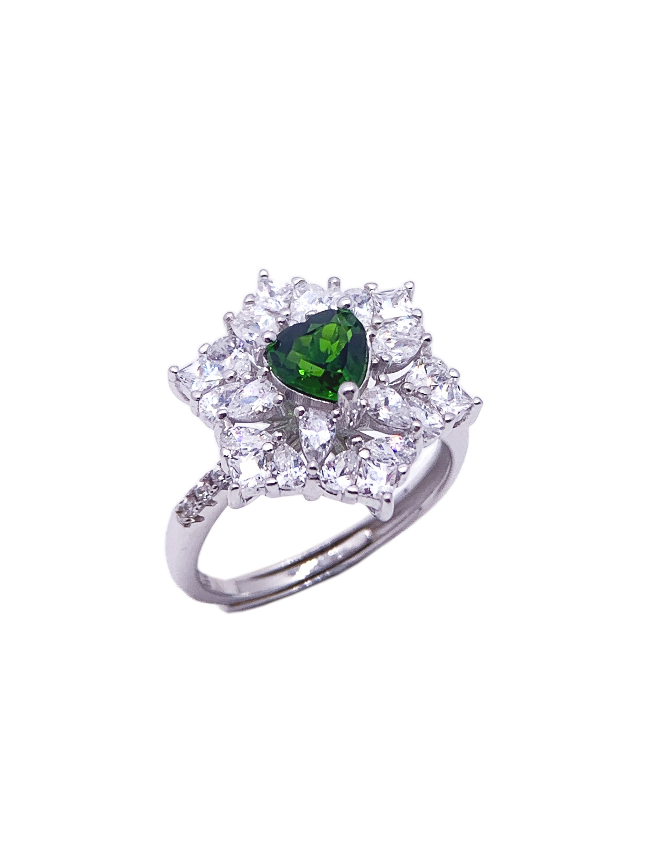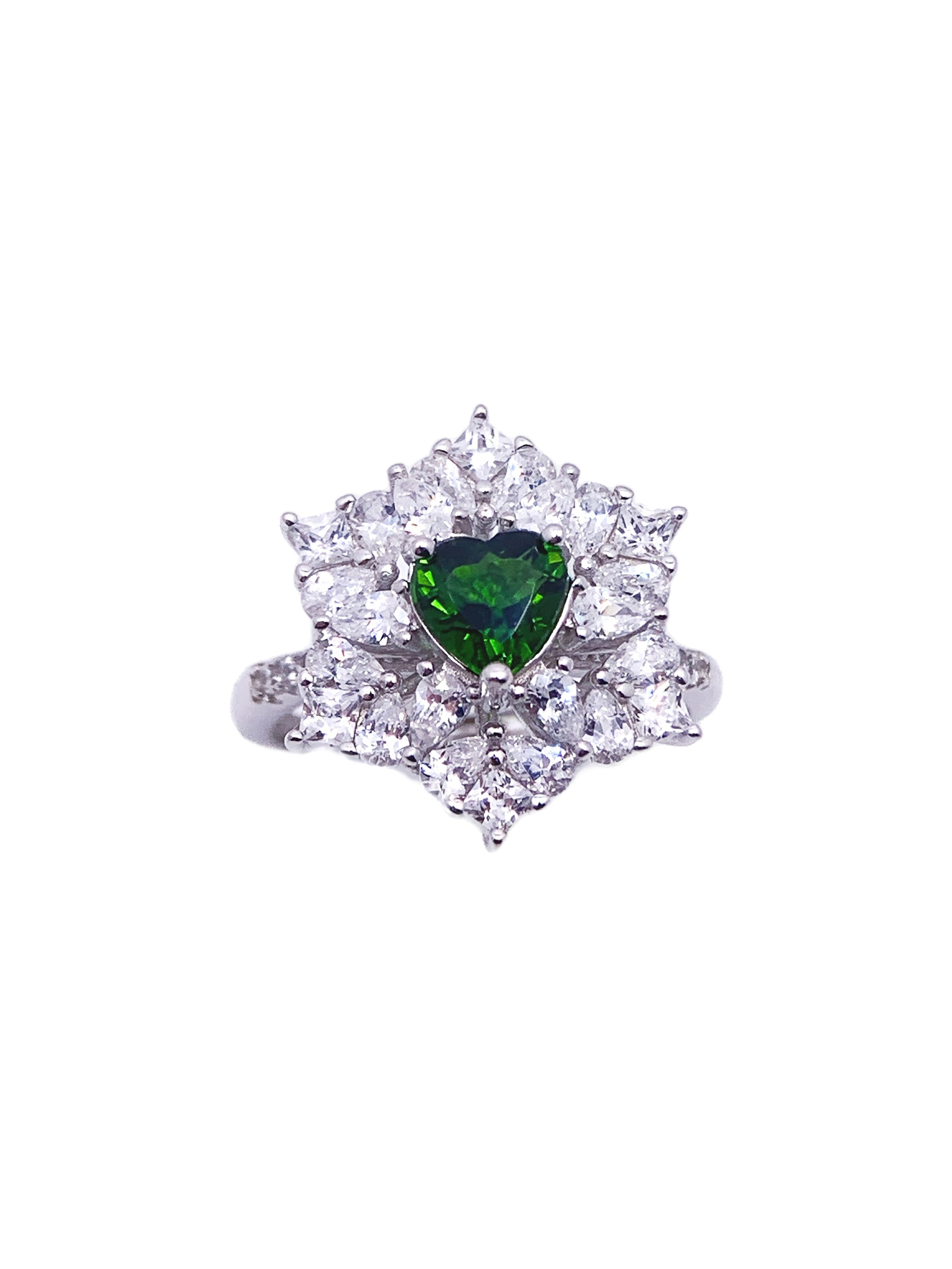 This stunning ring features a captivating, heart-shaped green gemstone as the focal point, surrounded by a brilliant halo of marquise and round-cut clear stones. The design resembles a blooming flower, with each stone carefully arranged to enhance the central gem’s vibrant color and allure. The white gold setting adds a cool, contemporary touch, perfectly complementing the intense green hue.