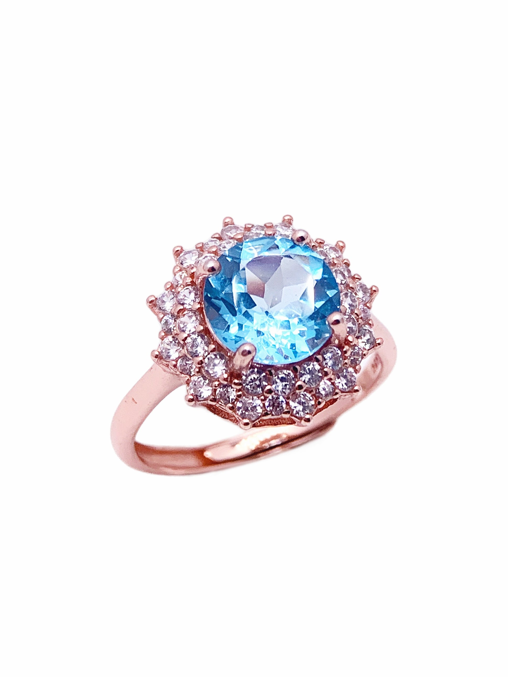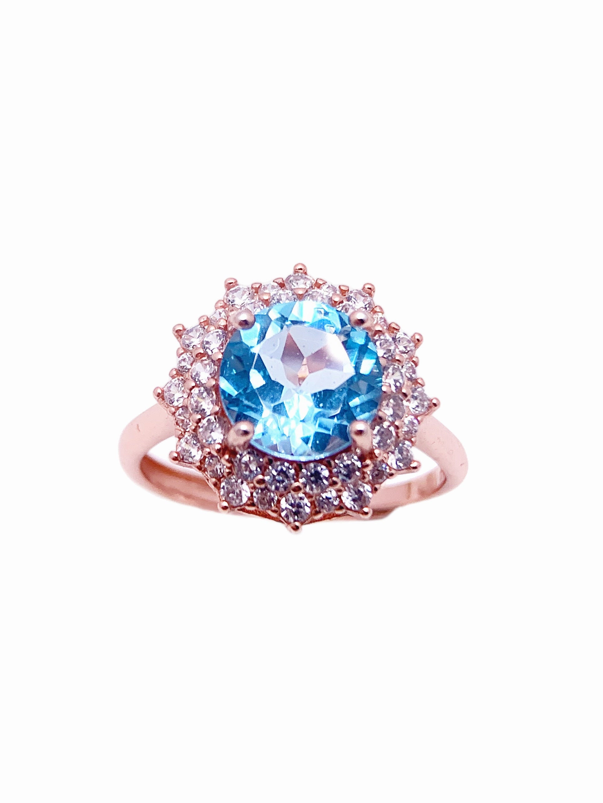 This elegant ring features a vibrant, round-cut blue topaz gemstone at its center, exuding a mesmerizing oceanic hue. Surrounding the topaz is a dazzling halo of white diamonds, each stone meticulously set to enhance the brilliance of the central gem. The rose gold band adds a warm, romantic touch that complements the cool tone of the blue topaz beautifully.