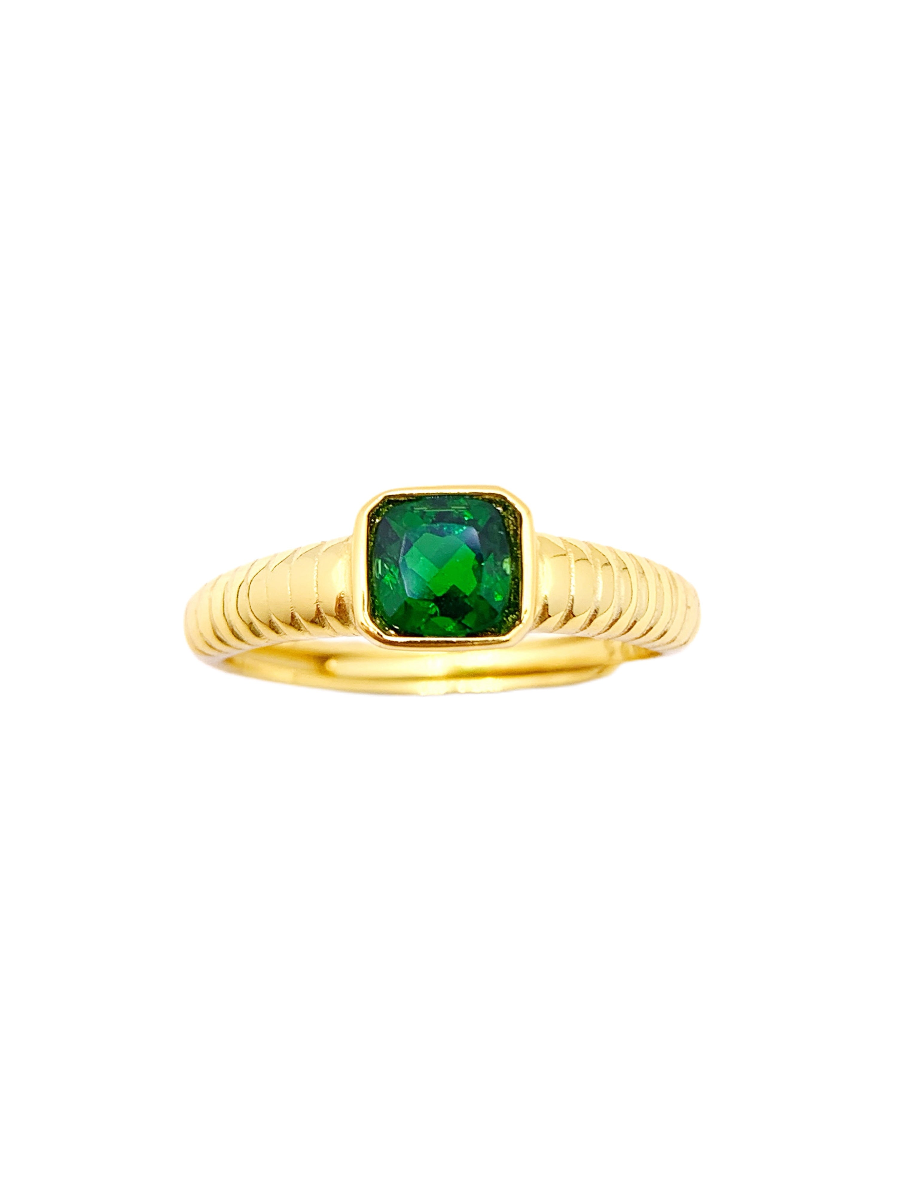 This striking ring features a vibrant, square-cut green garnet gemstone, beautifully set within a bezel setting that enhances its color and brilliance. The deep green hue of the garnet is contrasted elegantly by the warm, polished gold band. The band itself showcases a ribbed texture, adding a touch of modern flair and subtle detail to the ring's classic silhouette.
