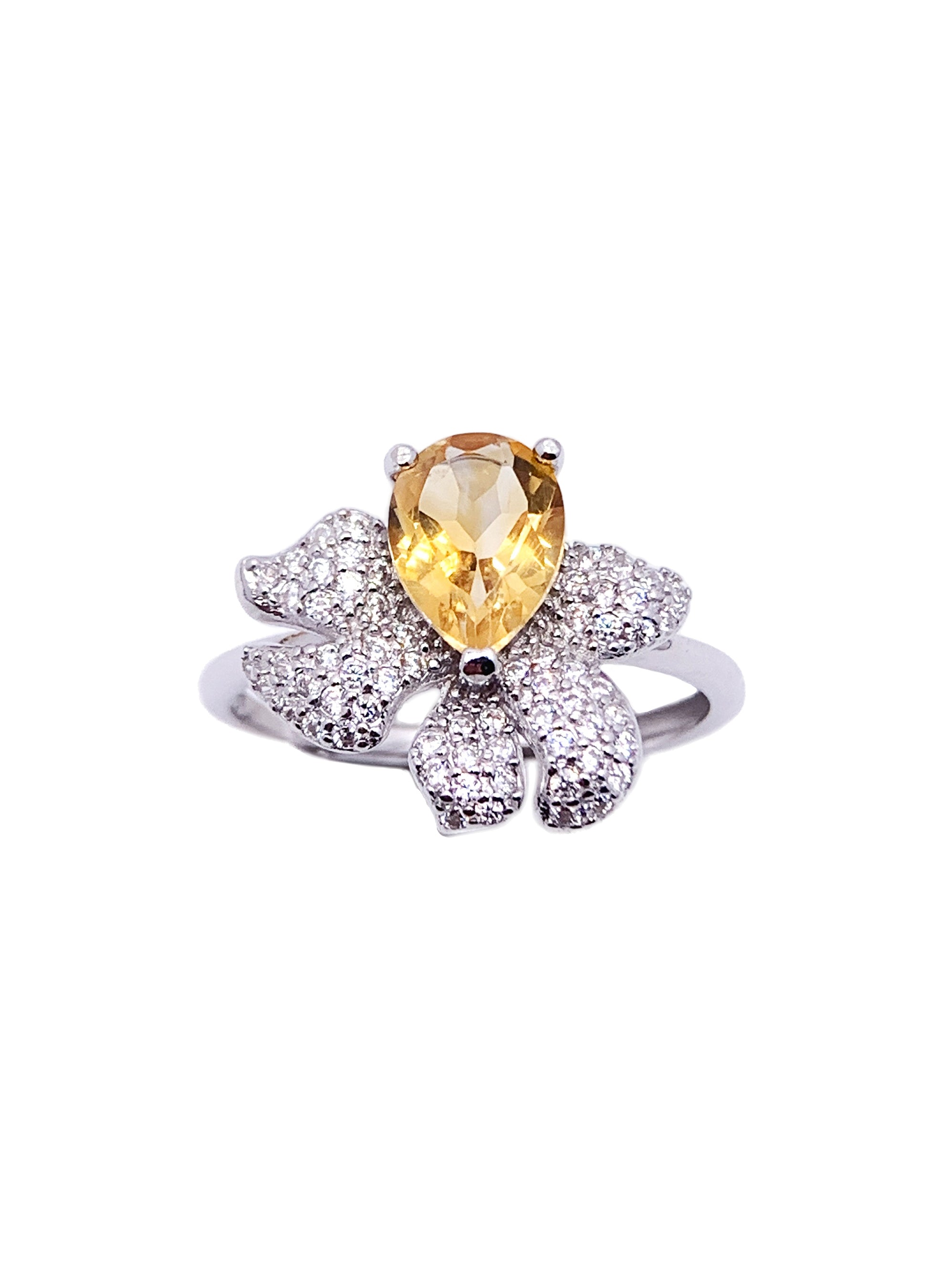 Embrace elegance with this enchanting ring, showcasing a pear-cut yellow gemstone set atop pavé diamond petals. The floral-inspired design and radiant centerpiece make this piece a perfect addition to any jewelry collection.