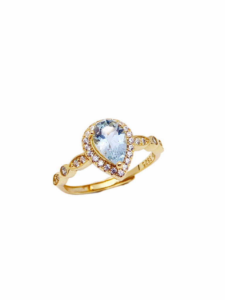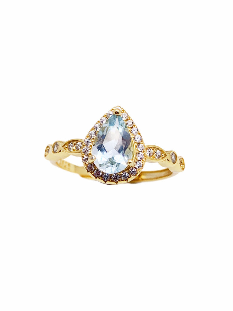 This exquisite ring features a mesmerizing teardrop-shaped aquamarine gemstone as its centerpiece, radiating a soft blue hue that captures the essence of tranquility. The aquamarine is framed by a halo of brilliant-cut diamonds, enhancing its sparkle and adding a touch of elegance. Set on a luxurious gold band adorned with intricate diamond accents, this ring showcases an artful design that combines sophistication with timeless appeal. Perfect for special occasions or as a meaningful gift, this piece is designed to make every moment feel extraordinary.