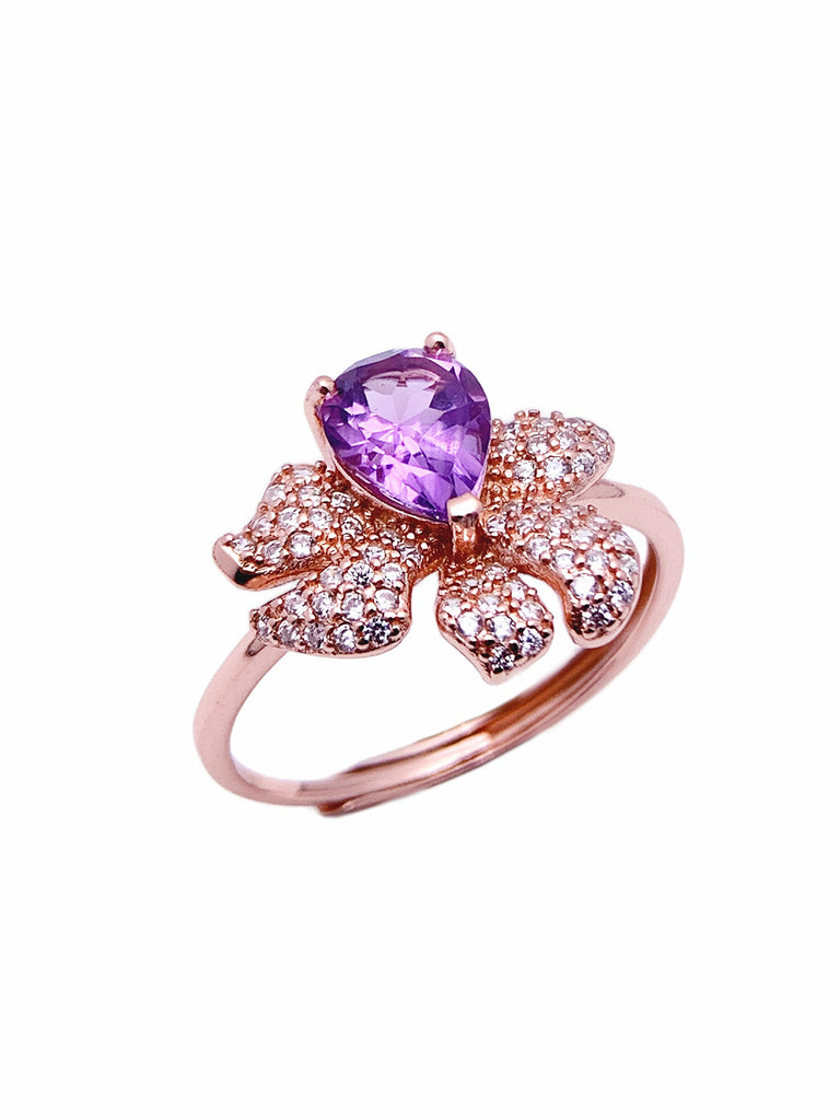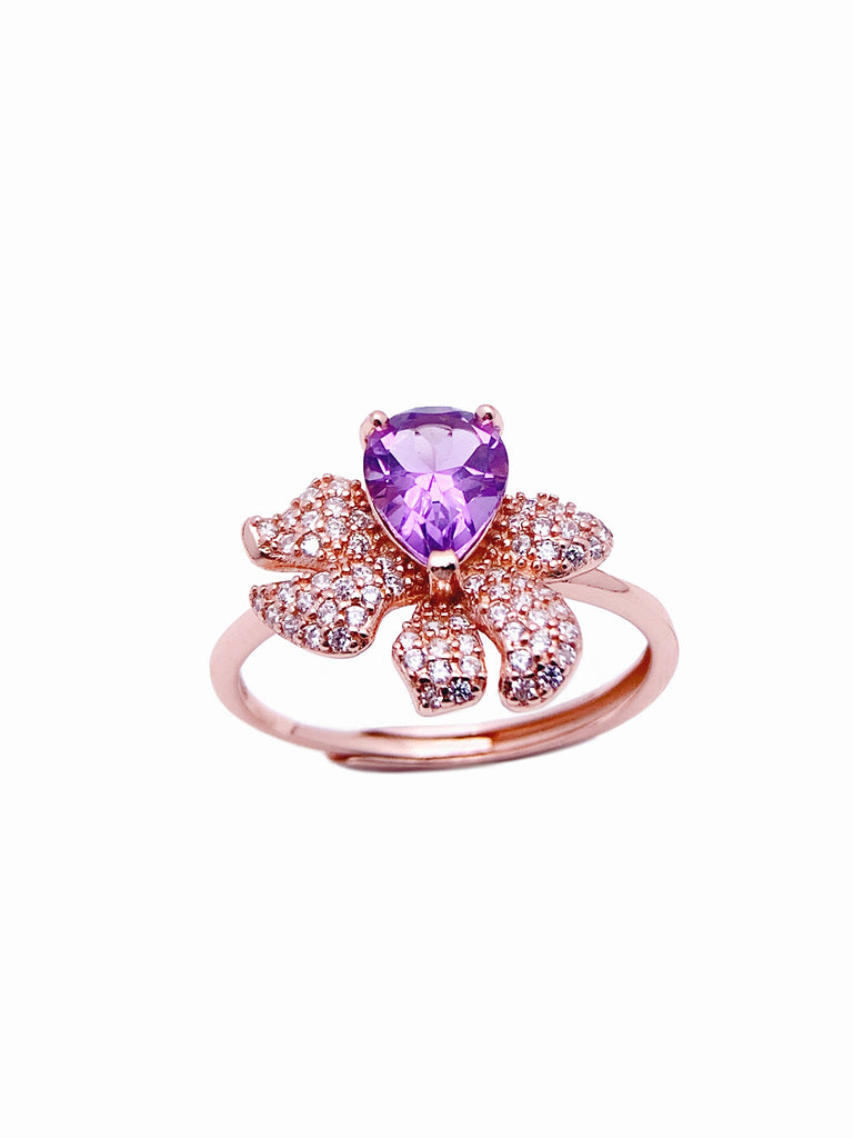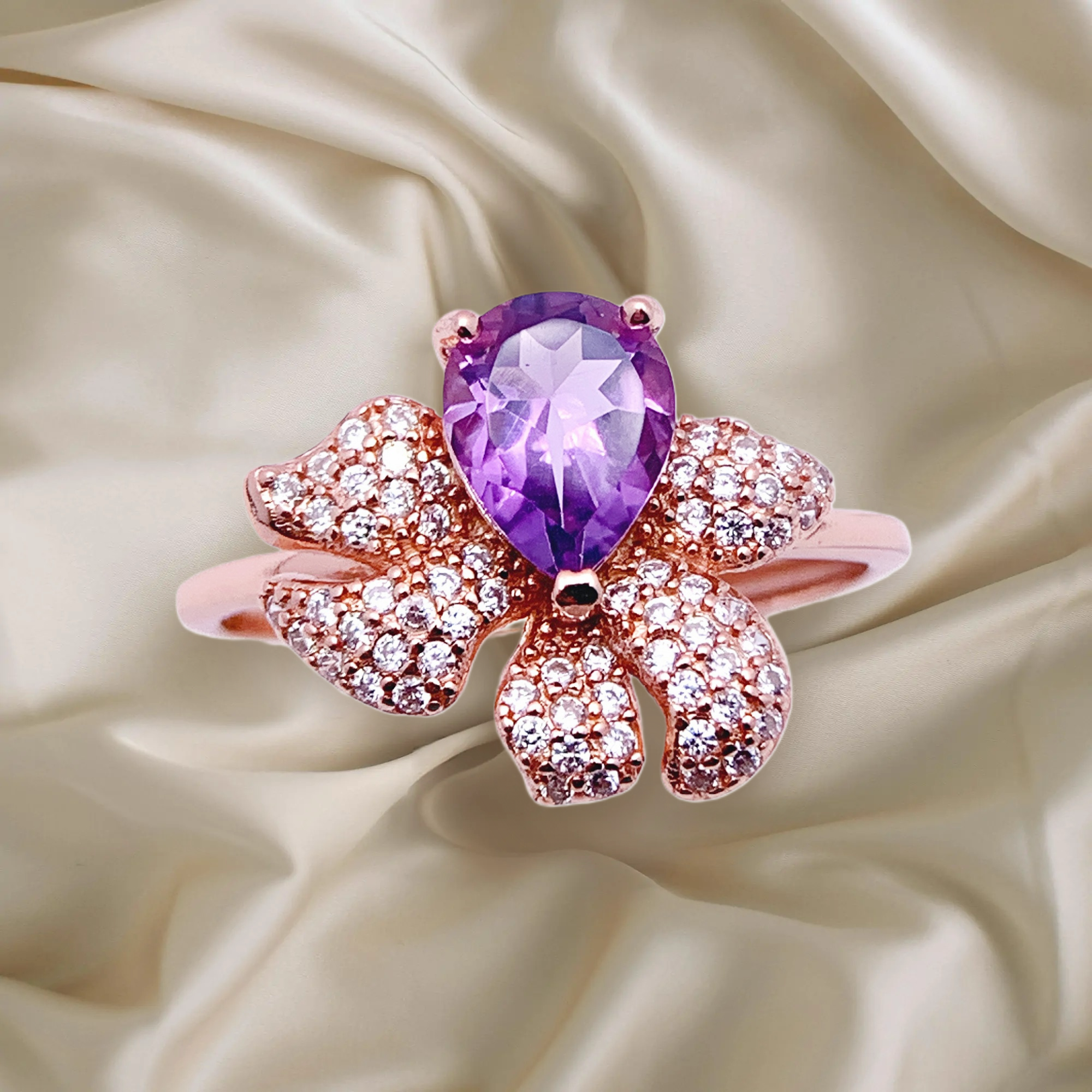 This enchanting ring features a vibrant teardrop-cut amethyst as its centerpiece, radiating a captivating purple hue that symbolizes peace and clarity. The amethyst is elegantly set atop a floral-inspired design, with each petal intricately adorned in pavé diamonds for a dazzling effect. Crafted in rose gold, this ring merges the soft warmth of the metal with the rich, regal tone of the amethyst, creating a harmonious blend of color and sparkle. Perfect for special occasions or as a unique addition to any jewelry collection, this ring embodies elegance and sophistication.