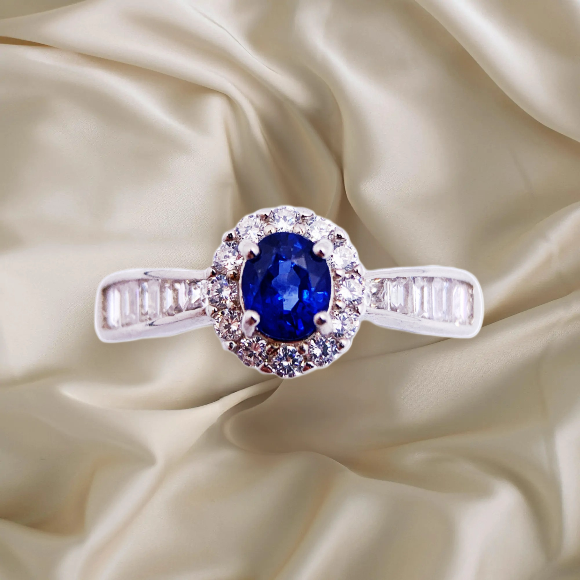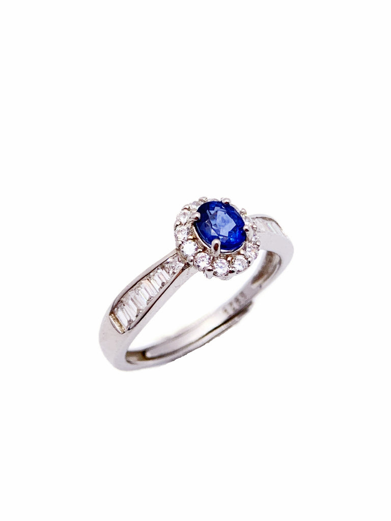 This timeless engagement ring features a captivating oval-cut sapphire as its centerpiece, radiating a deep, royal blue that symbolizes loyalty and love. Encircling the sapphire is a delicate halo of round-cut diamonds, adding a brilliant sparkle that enhances the gem’s beauty. The band is crafted in polished sliver and adorned with a row of baguette-cut diamonds, giving the piece a refined and sophisticated touch. Perfect for marking a special occasion, this ring exudes elegance and classic charm.