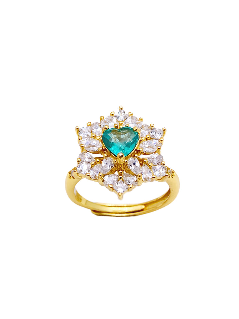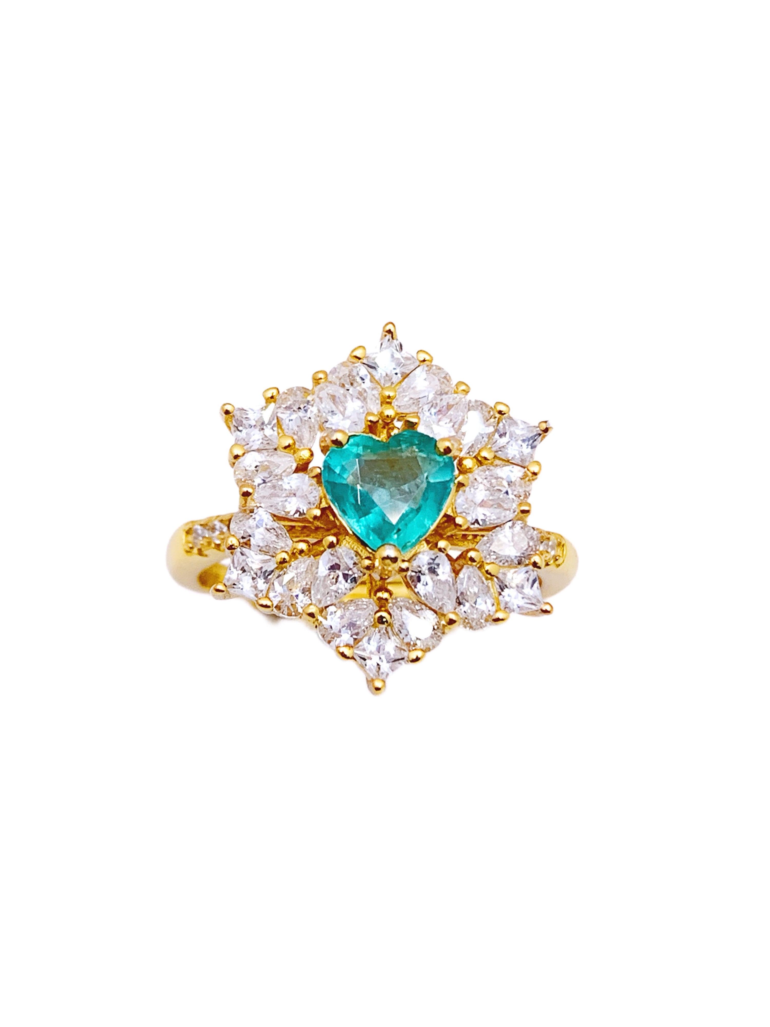 This enchanting ring features a heart-shaped emerald as its centerpiece, glowing with a captivating green hue that symbolizes love and prosperity. Surrounding the emerald is a floral-inspired halo of marquise-cut diamonds, each carefully placed to create a blossoming effect that adds a touch of romance and elegance. Set in high-polished yellow gold, this ring combines the beauty of precious gemstones with a classic, luxurious design. Perfect for those who appreciate unique and meaningful jewelry, this piece makes a stunning statement on any occasion.