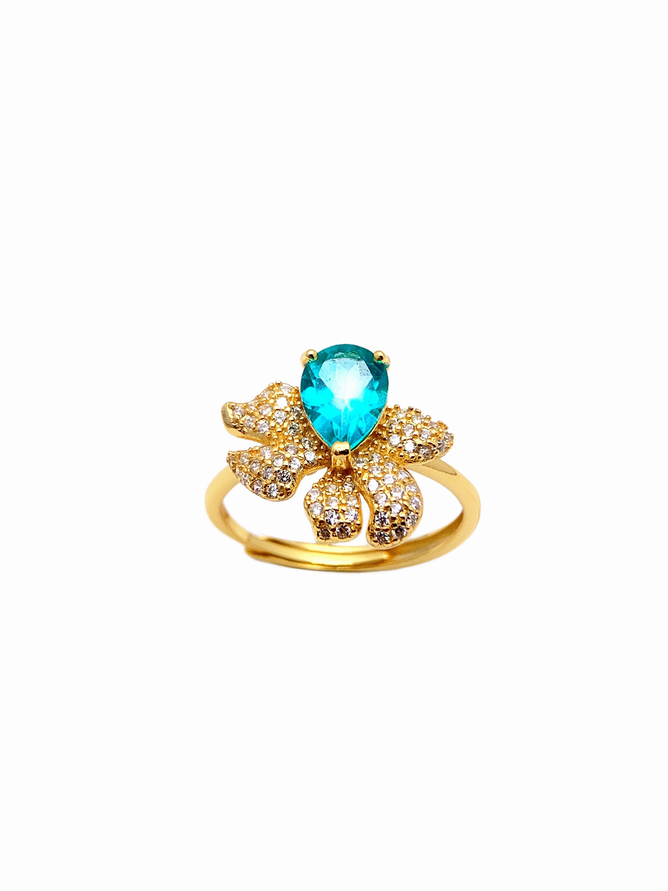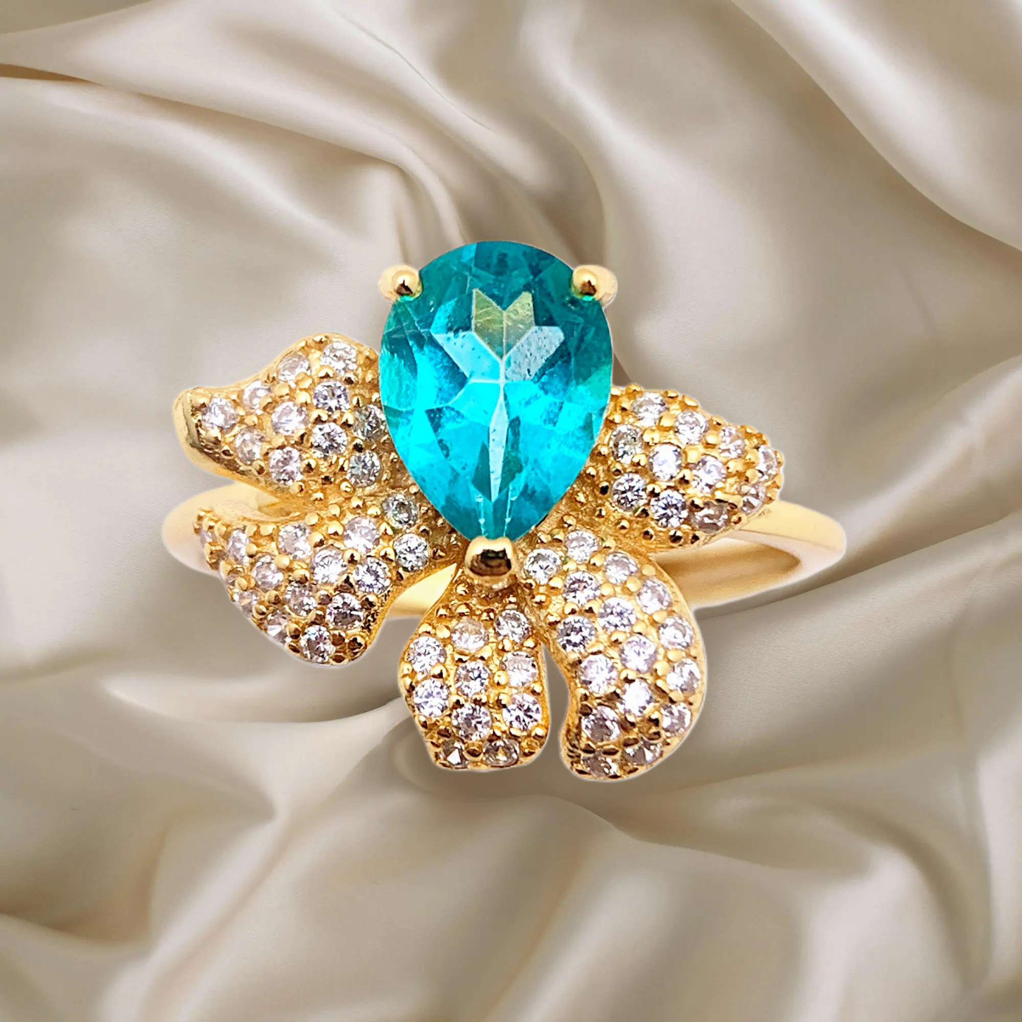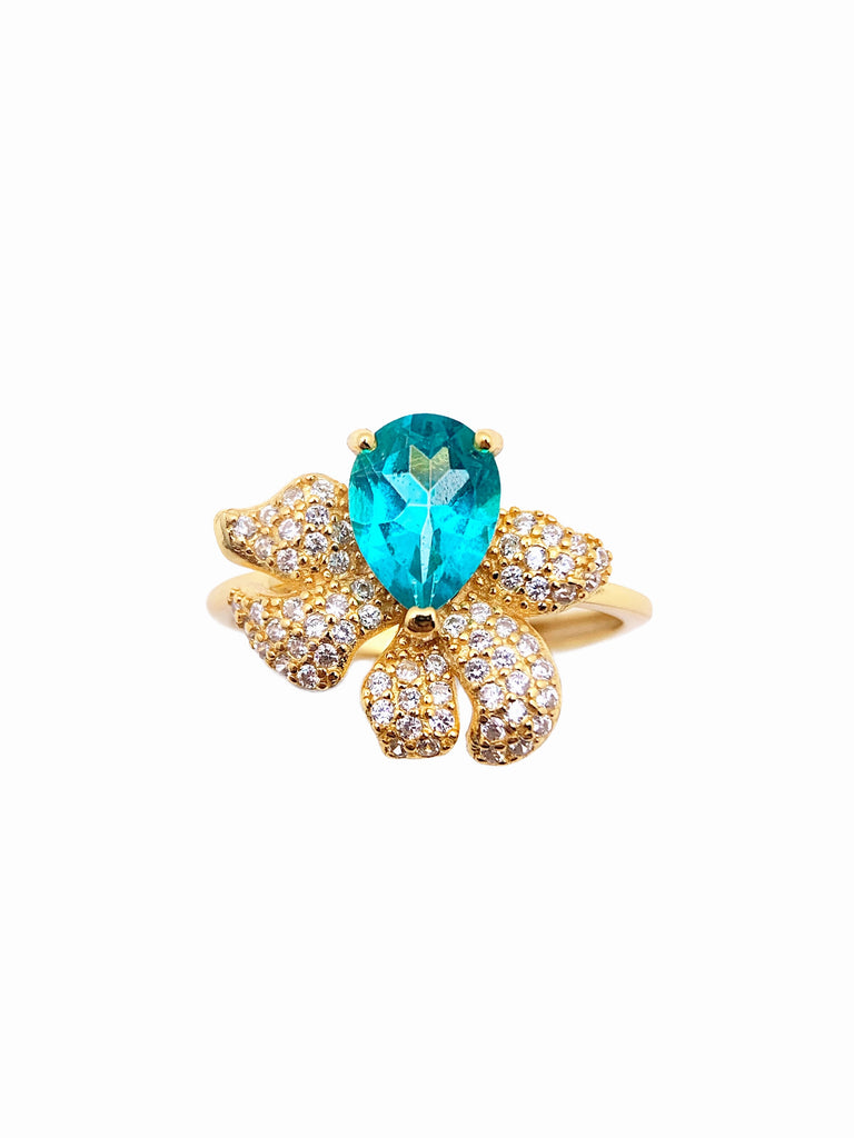 This exquisite ring showcases a captivating teardrop-cut aquamarine, exuding a fresh blue hue that symbolizes tranquility and elegance. Set in luxurious gold, the aquamarine is embraced by a unique floral-inspired design, with each petal adorned in pavé diamonds for a dazzling, radiant effect. Combining the vibrant aquamarine with the sparkling diamond-studded petals creates a statement piece that is both bold and graceful. Perfect for adding a touch of refined beauty to any occasion, this ring is a tribute to nature’s charm and timeless elegance.