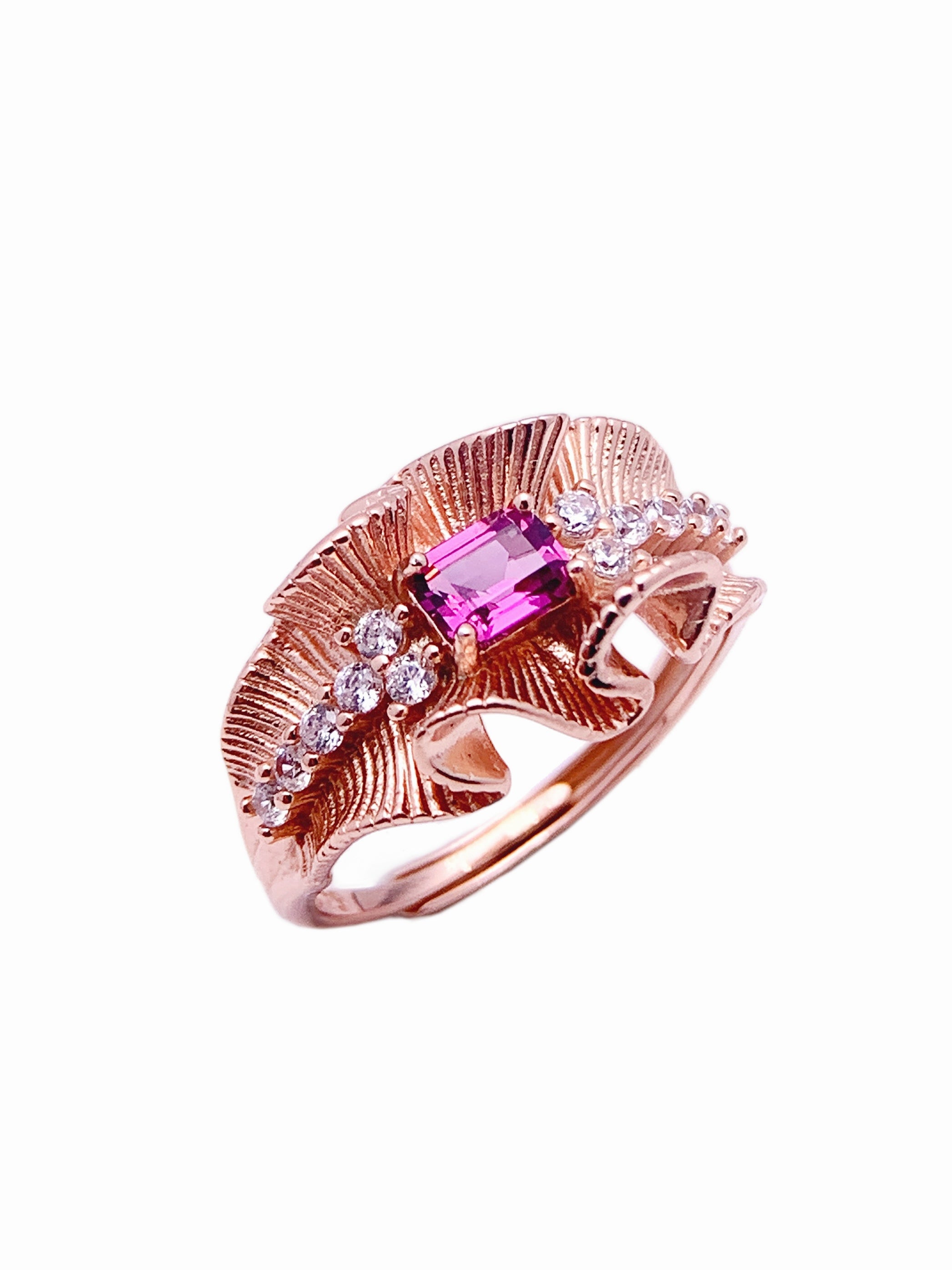 Make a statement with this stunning ring featuring a vibrant emerald-cut pink sapphire at its center, symbolizing strength and passion. The pink sapphire is set within an intricately textured rose gold band designed to resemble a flowing ribbon, adding an elegant, sculptural quality to the piece. Adorned with sparkling round diamonds on either side, this ring beautifully combines modern flair with vintage charm. Perfect for those who appreciate bold, distinctive jewelry, this ring is sure to captivate and inspire.