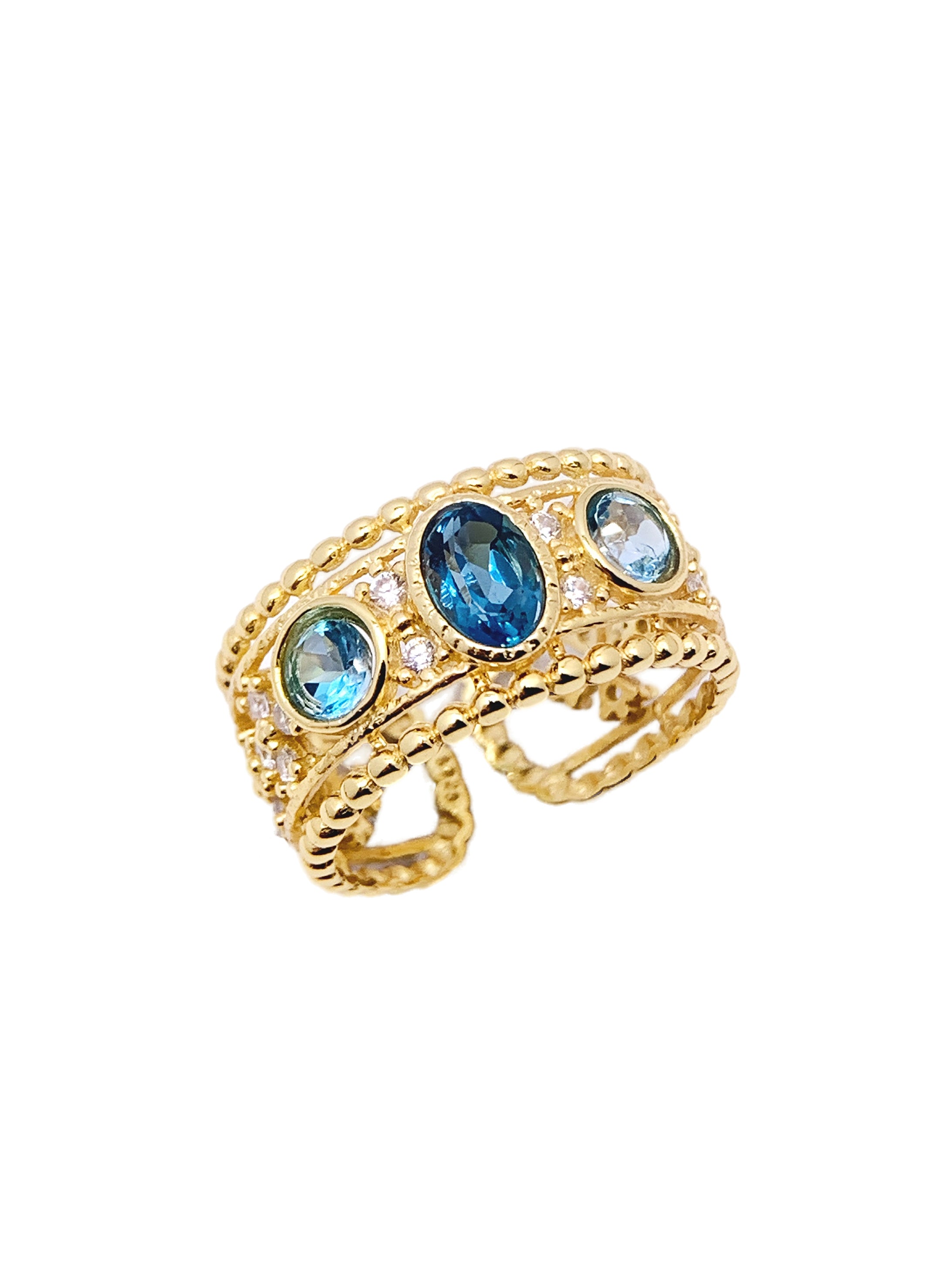 This exquisite ring features a captivating design with multiple blue topaz gemstones set in a wide, intricate gold band. The oval-cut blue topaz stones radiate a refreshing sky-blue hue, symbolizing calm and clarity, while small diamond accents add a touch of sparkle between each stone. The band itself is adorned with detailed beading, giving it a vintage-inspired look with a modern twist. Perfect for those who appreciate bold, unique jewelry, this ring is a statement piece that combines elegance and craftsmanship.