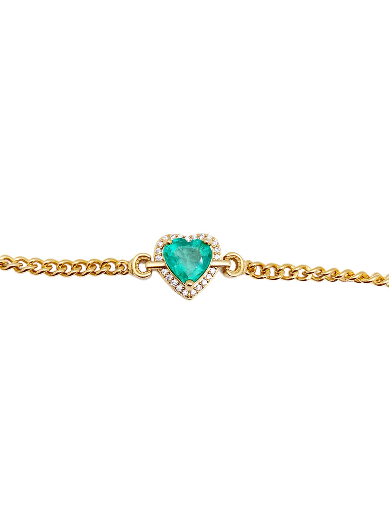This elegant bracelet features a charming heart-shaped emerald as its focal point, surrounded by a delicate halo of sparkling diamonds that accentuate its vibrant green hue. Set in a polished gold frame, the emerald centerpiece is connected to a stylish gold chain, adding a modern touch to this romantic design. With an adjustable extension chain, this bracelet ensures a comfortable fit, making it perfect for any occasion. Ideal as a gift or as a meaningful addition to your own collection, this piece embodies both beauty and sentiment.