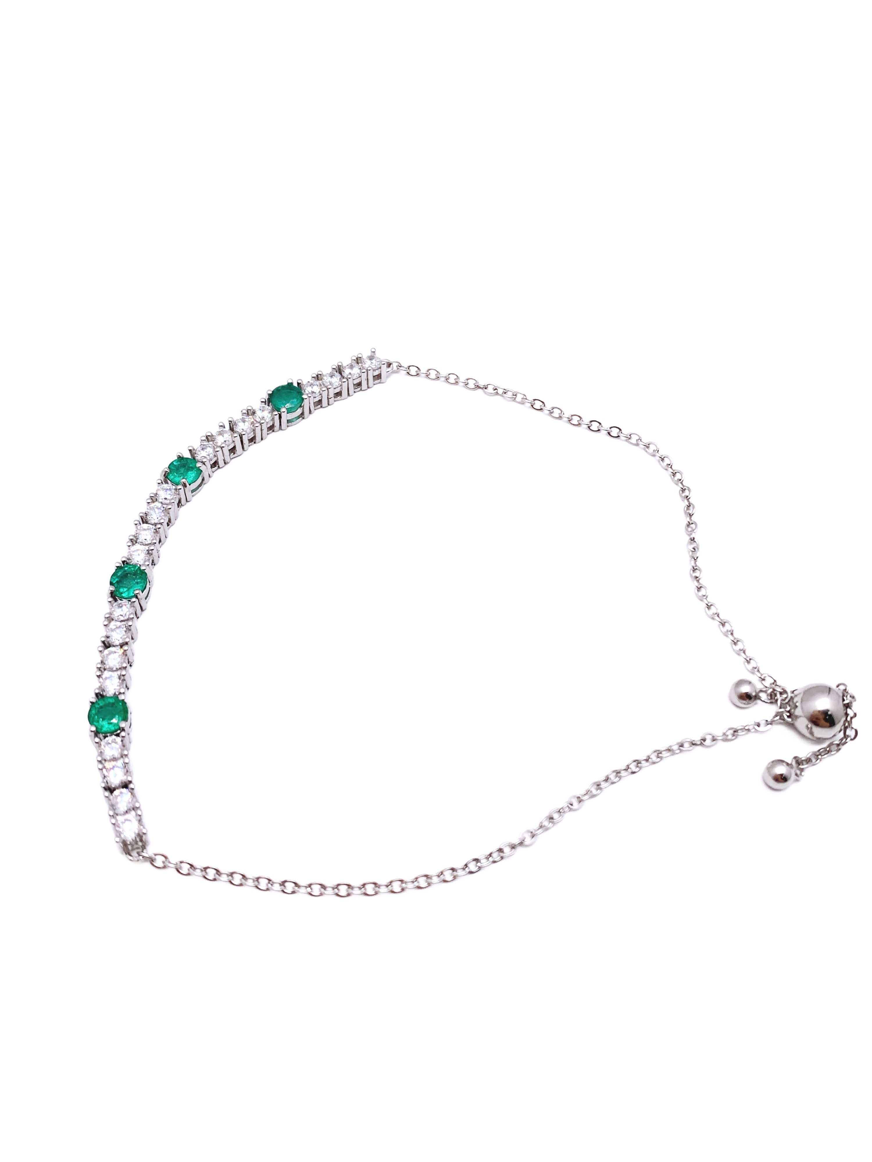 This elegant bracelet features a series of vibrant green emeralds, each separated by sparkling diamonds, creating a sophisticated yet subtle design. Set in sterling silver, the emeralds add a touch of color and vitality, while the diamonds bring a delicate shimmer. The bracelet is crafted with an adjustable sliding chain, allowing for a customizable and comfortable fit. Perfect for any occasion, this bracelet offers a timeless elegance that complements any outfit.