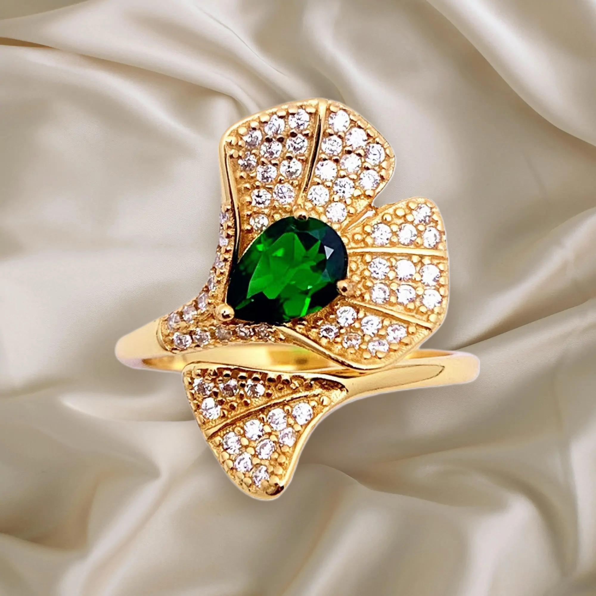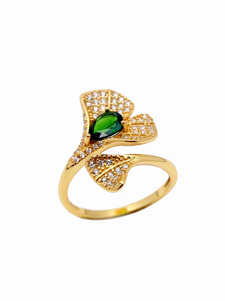 This unique ring showcases a nature-inspired design with a beautifully crafted leaf motif. The focal point is a pear-shaped green gemstone, symbolizing vitality and growth, nestled within the leaf design. The band is gold-plated, and the leaves are delicately accented with small crystals, adding a touch of sparkle and elegance. The open style of the ring gives it a modern, adjustable feel, perfect for nature lovers and those who appreciate unique, organic designs.