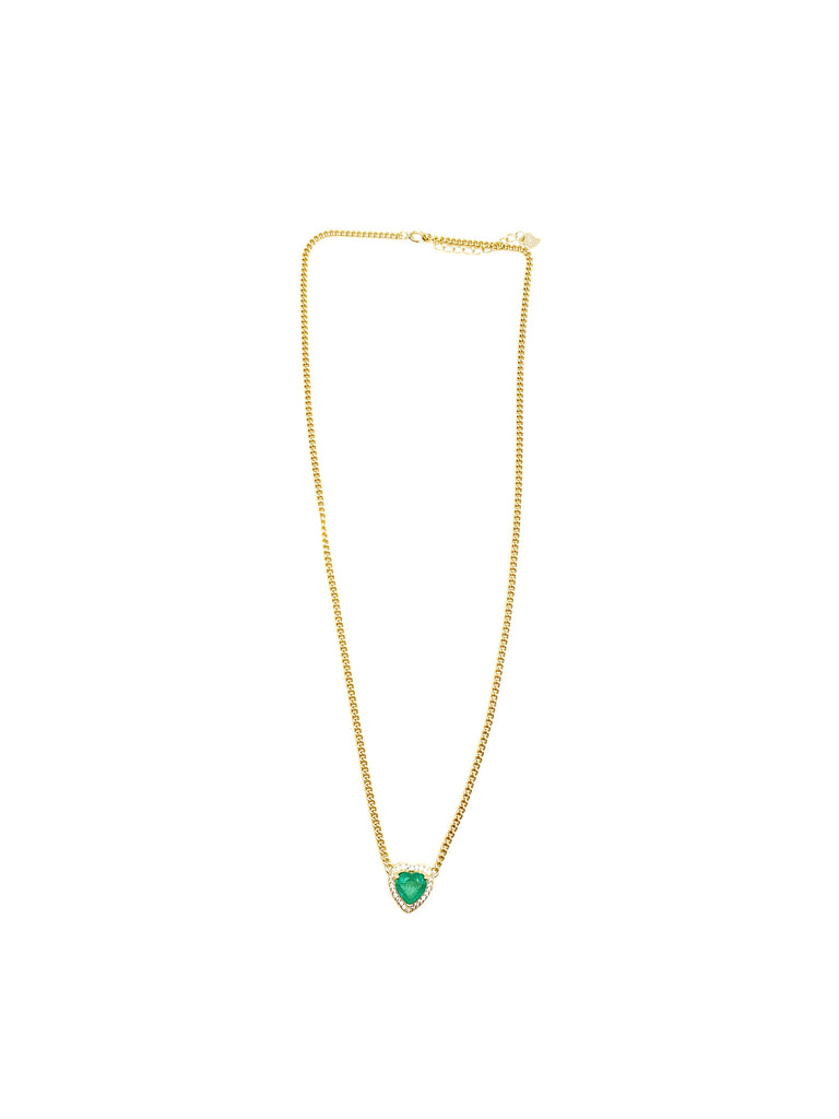 This elegant necklace features a captivating heart-shaped emerald as the centerpiece, encased in a radiant gold-plated setting. The emerald is framed with a halo of small, sparkling stones that add an extra layer of sophistication and shimmer. The pendant is attached to a sturdy gold-plated chain with a twisted rope design, which complements the pendant’s luxurious look.