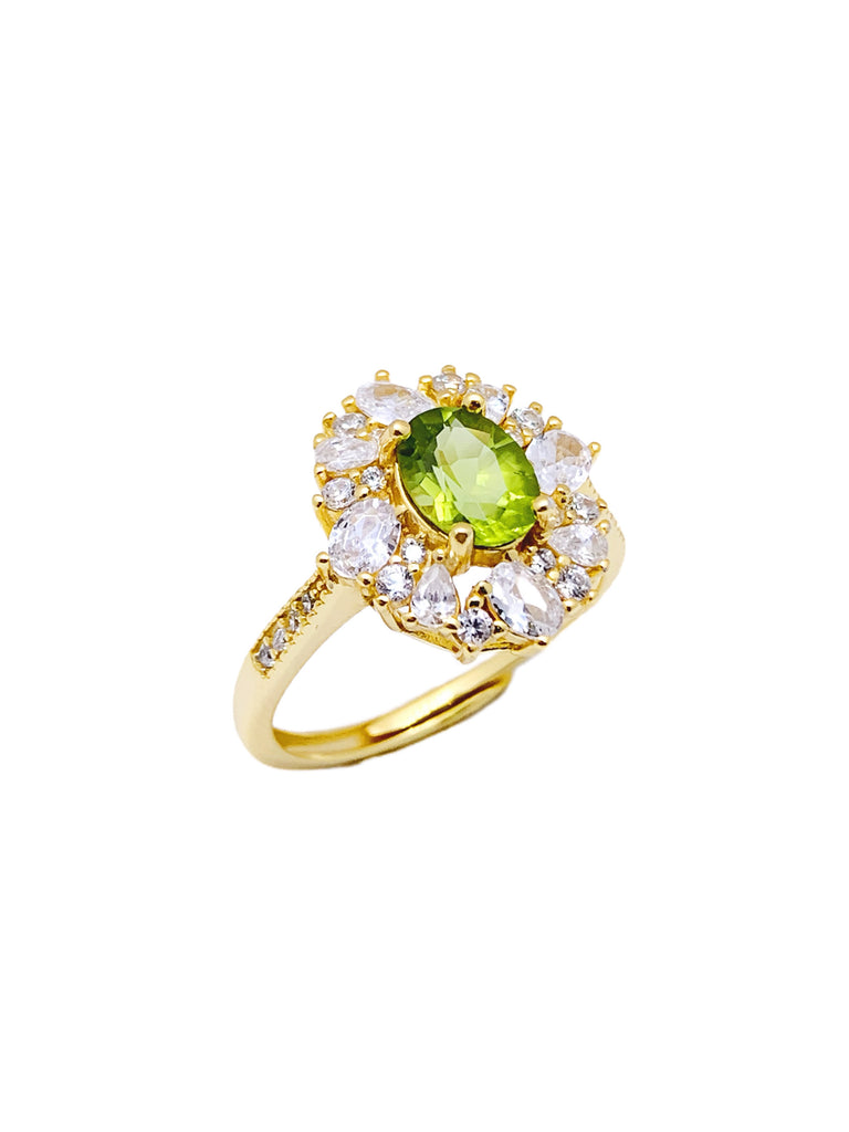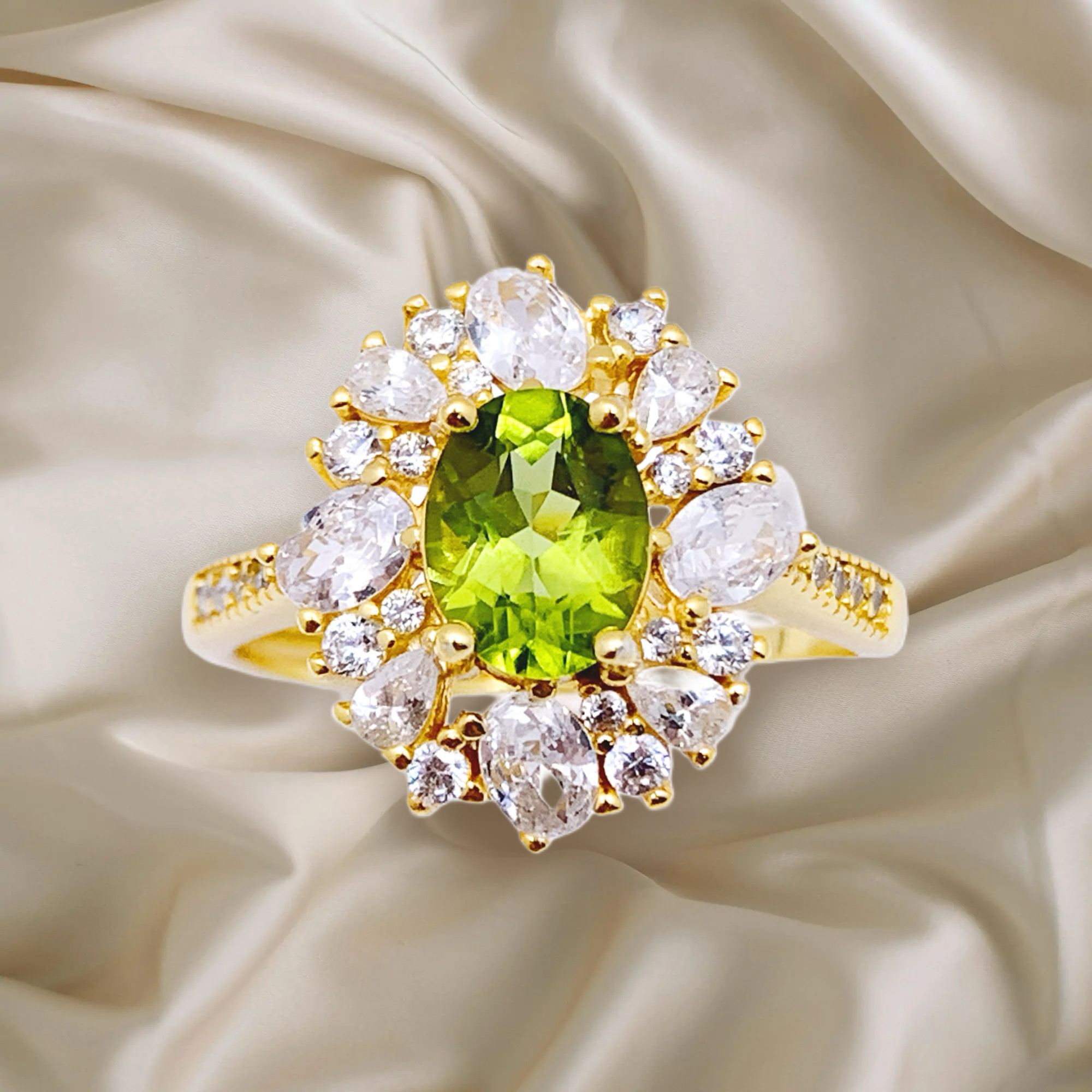 This luxurious gold-tone ring showcases a captivating oval-cut peridot as its centerpiece, radiating a vibrant green hue that symbolizes growth and renewal. Surrounding the peridot is a halo of brilliant-cut diamonds, arranged in an alternating pattern of oval and pear shapes, creating a floral-inspired design that enhances the ring’s elegance and sparkle. The band is finely detailed with additional diamonds, adding a refined touch to the overall design.