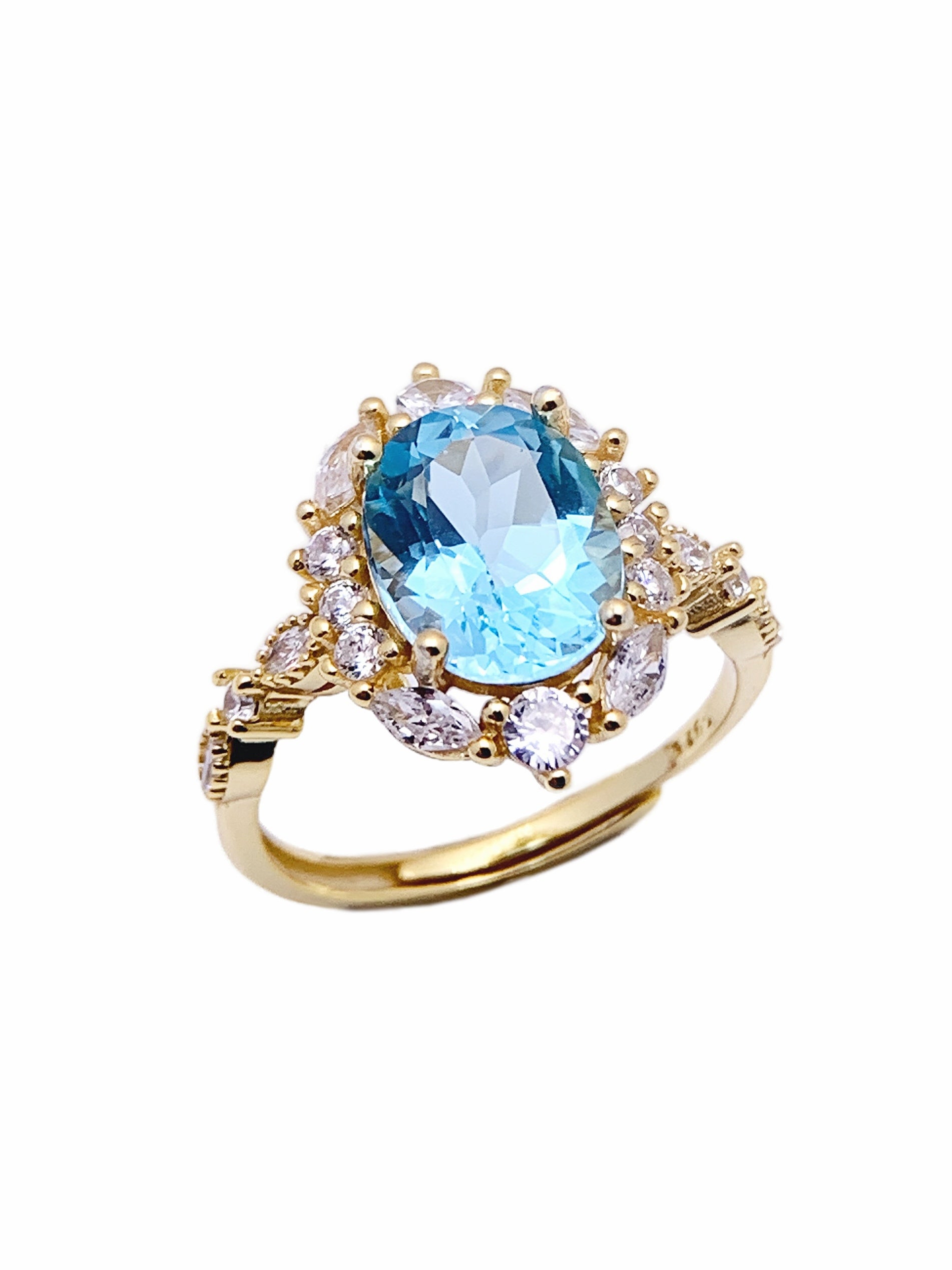 This exquisite ring highlights a large, oval-cut aquamarine gemstone as the centerpiece, radiating a serene and mesmerizing blue hue reminiscent of clear ocean waters. Surrounding the aquamarine is a dazzling halo of round and marquise-cut diamonds, arranged to form a floral-inspired design that enhances the brilliance and elegance of the ring. The gold-tone band is adorned with additional diamond accents, adding to the luxurious appeal.